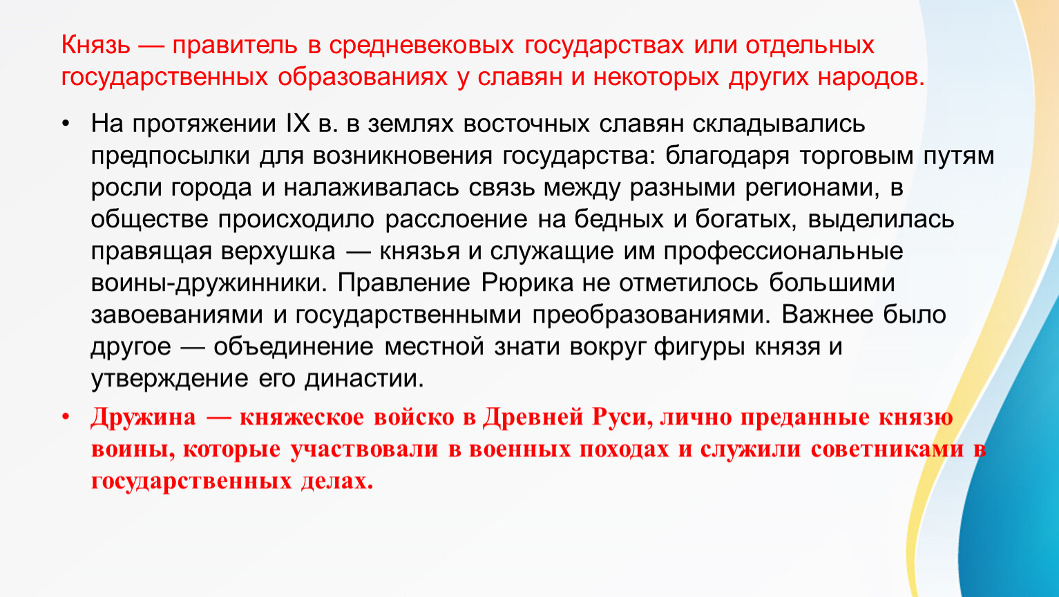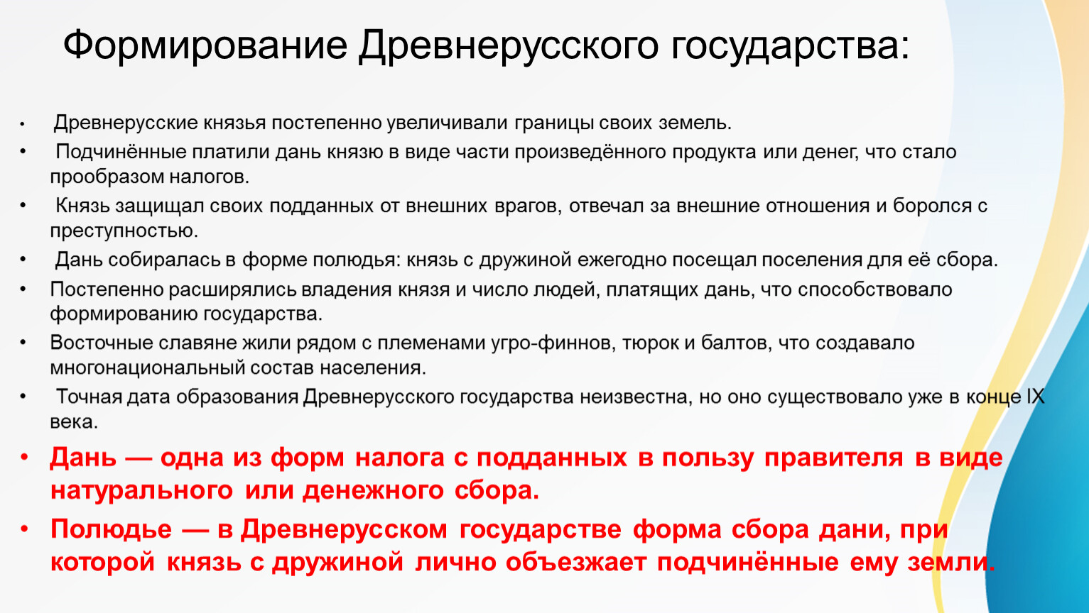 Постепенно расширялись владения князя и число людей, платящих дань, что способствовало формированию государства.