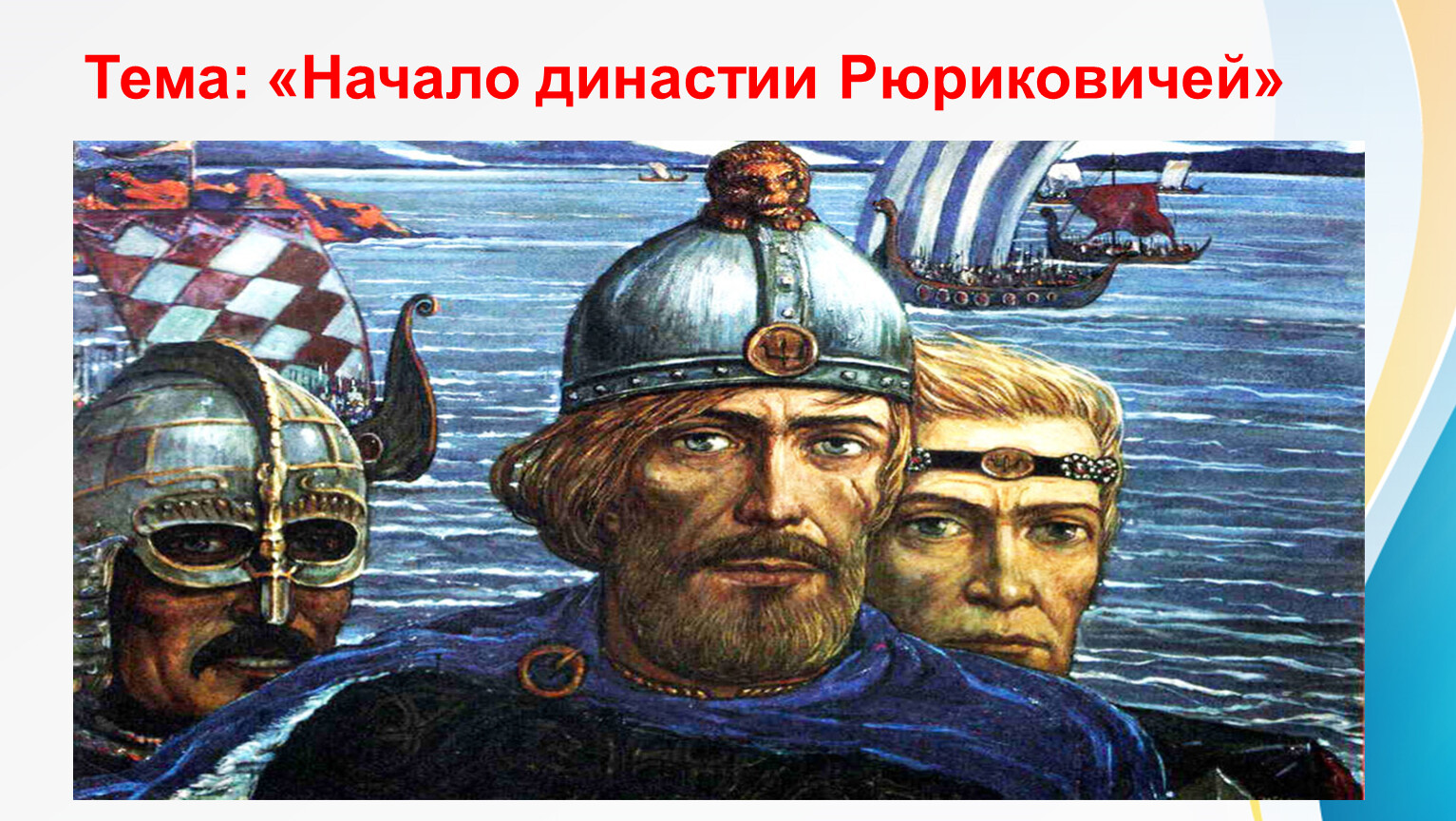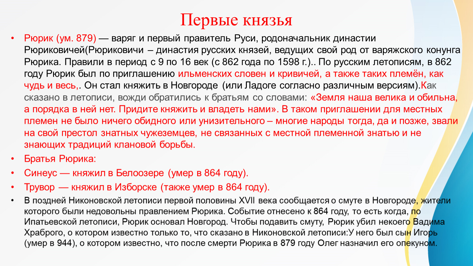 Рюрик (ум. 879) — варяг и первый правитель Руси, родоначальник династии Рюриковичей(Рюриковичи – династия русских князей, ведущих свой род от варяжского конунга Рюрика. Правили в период с 9 по 16 век (с 862 года по 1598 г.).. По русским летописям, в 862 году Рюрик был по приглашению ильменских словен и кривичей, а также таких племён, как чудь и весь,. Он стал княжить в Новгороде (или Ладоге согласно различным версиям).Как сказано в летописи, вожди обратились к братьям со словами: «Земля наша велика и обильна, а порядка в ней нет. Придите княжить и владеть нами». В таком приглашении для местных племен не было ничего обидного или унизительного – многие народы тогда, да и позже, звали на свой престол знатных чужеземцев, не связанных с местной племенной знатью и не знающих традиций клановой борьбы.