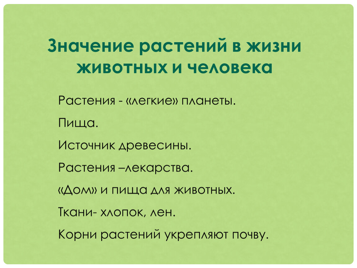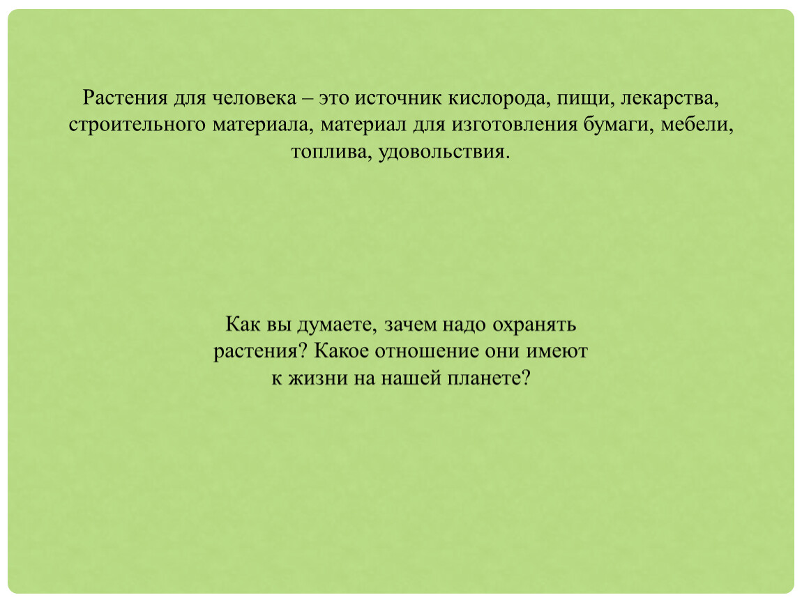 Растения для человека – это источник кислорода, пищи, лекарства, строительного материала, материал для изготовления бумаги, мебели, топлива, удовольствия.