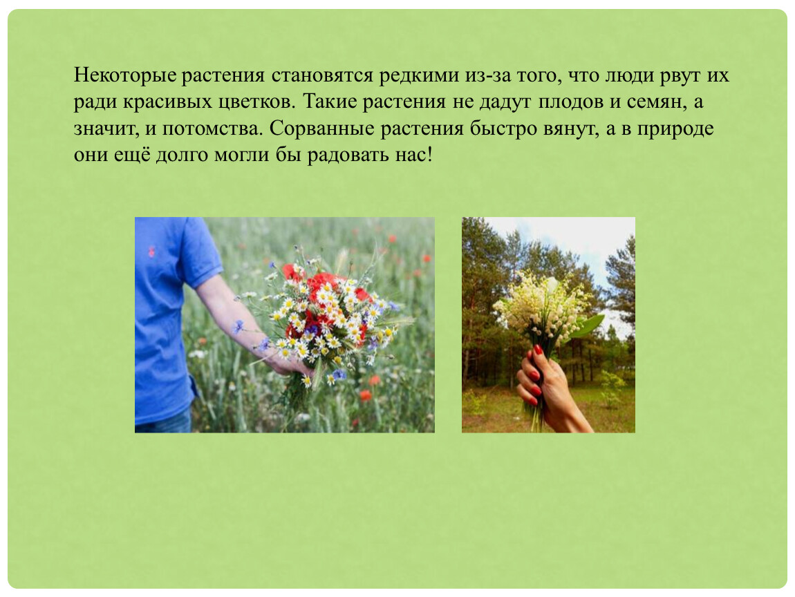 Некоторые растения становятся редкими из-за того, что люди рвут их ради красивых цветков. Такие растения не дадут плодов и семян, а значит, и потомства. Сорванные растения быстро вянут, а в природе они ещё долго могли бы радовать нас!