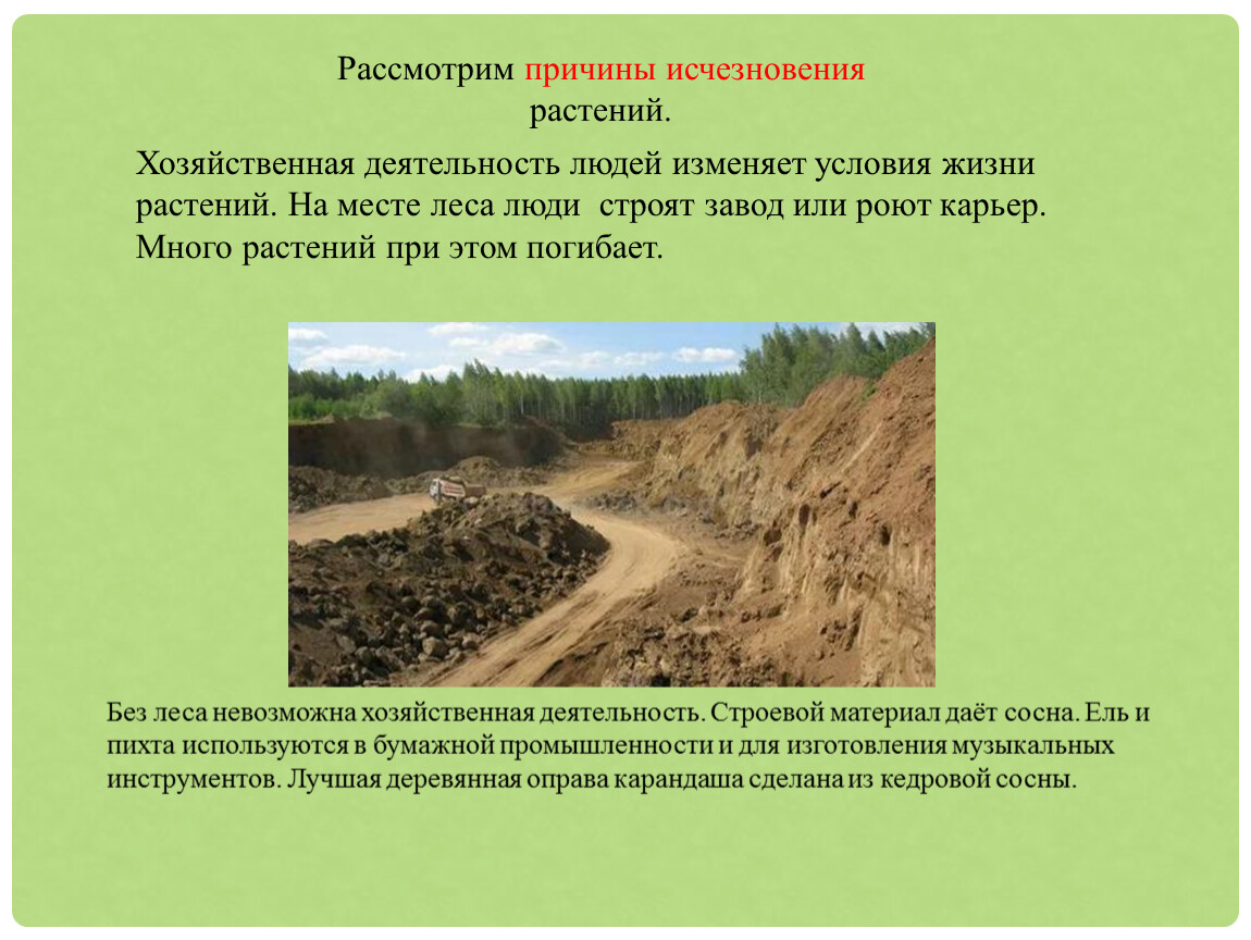 Хозяйственная деятельность людей изменяет условия жизни растений. На месте леса люди строят завод или роют карьер. Много растений при этом погибает.