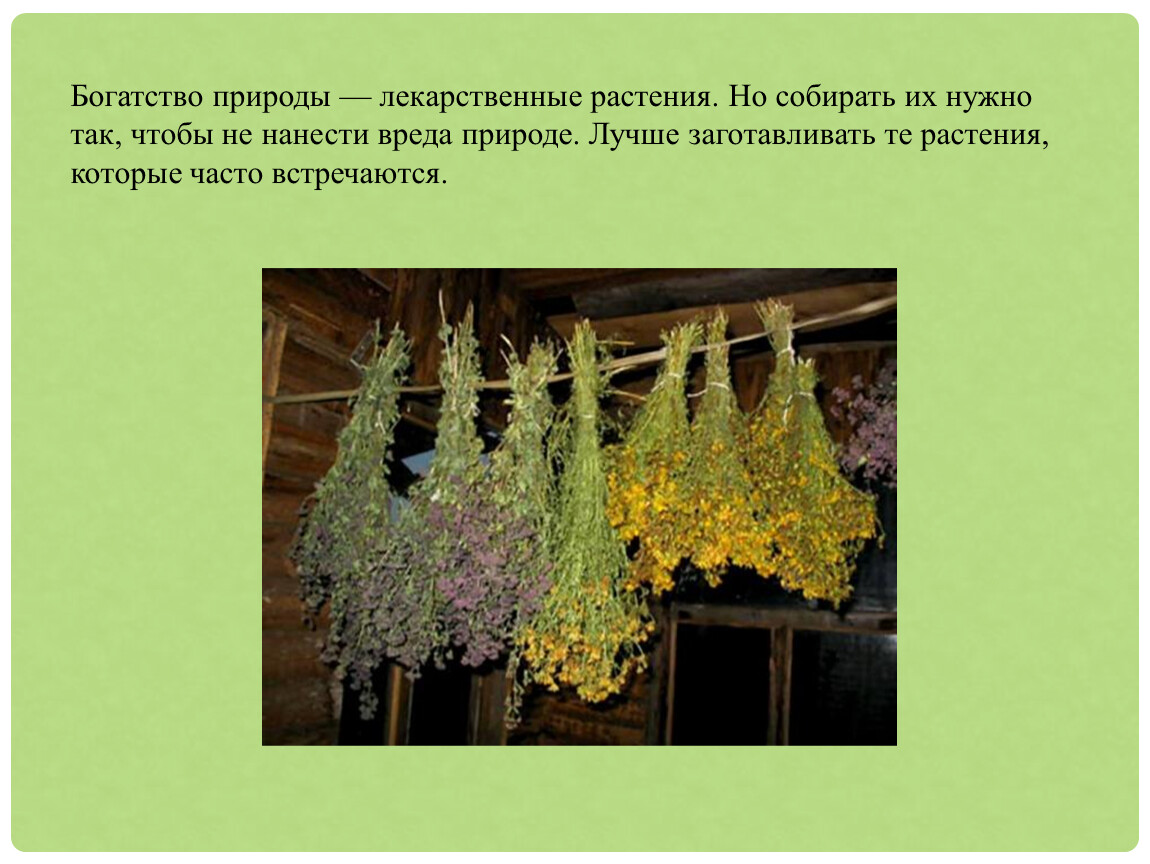 Богатство природы — лекарственные растения. Но собирать их нужно так, чтобы не нанести вреда природе. Лучше заготавливать те растения, которые часто встречаются.