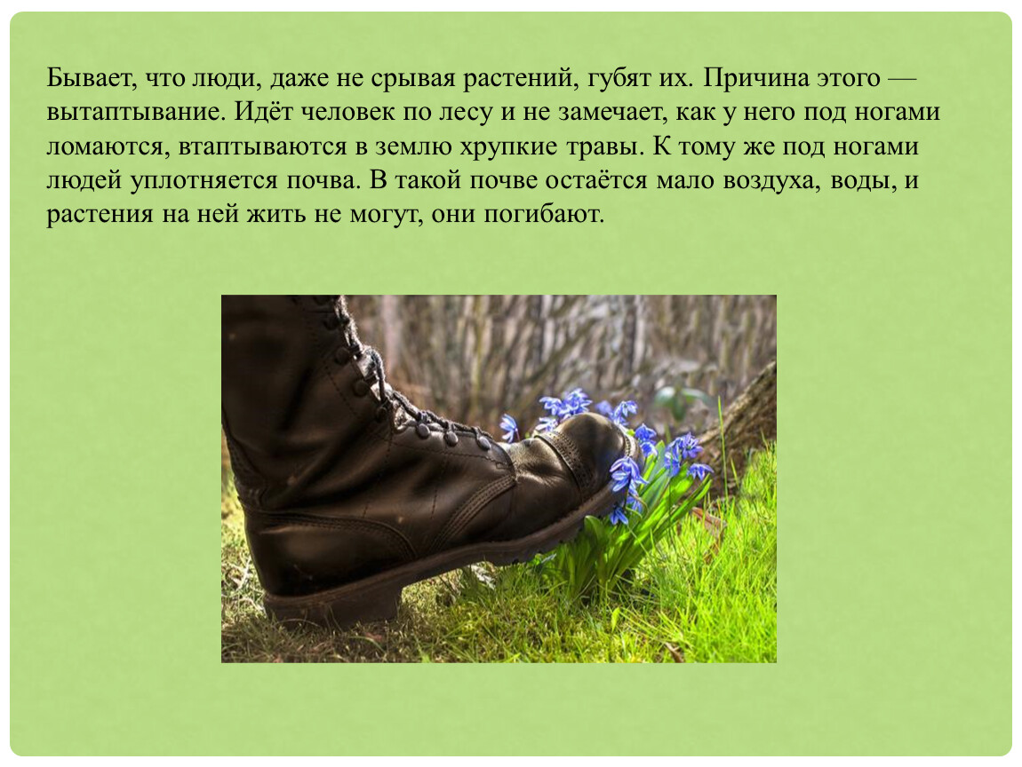 Бывает, что люди, даже не срывая растений, губят их. Причина этого — вытаптывание. Идёт человек по лесу и не замечает, как у него под ногами ломаются, втаптываются в землю хрупкие травы. К тому же под ногами людей уплотняется почва. В такой почве остаётся мало воздуха, воды, и растения на ней жить не могут, они погибают.