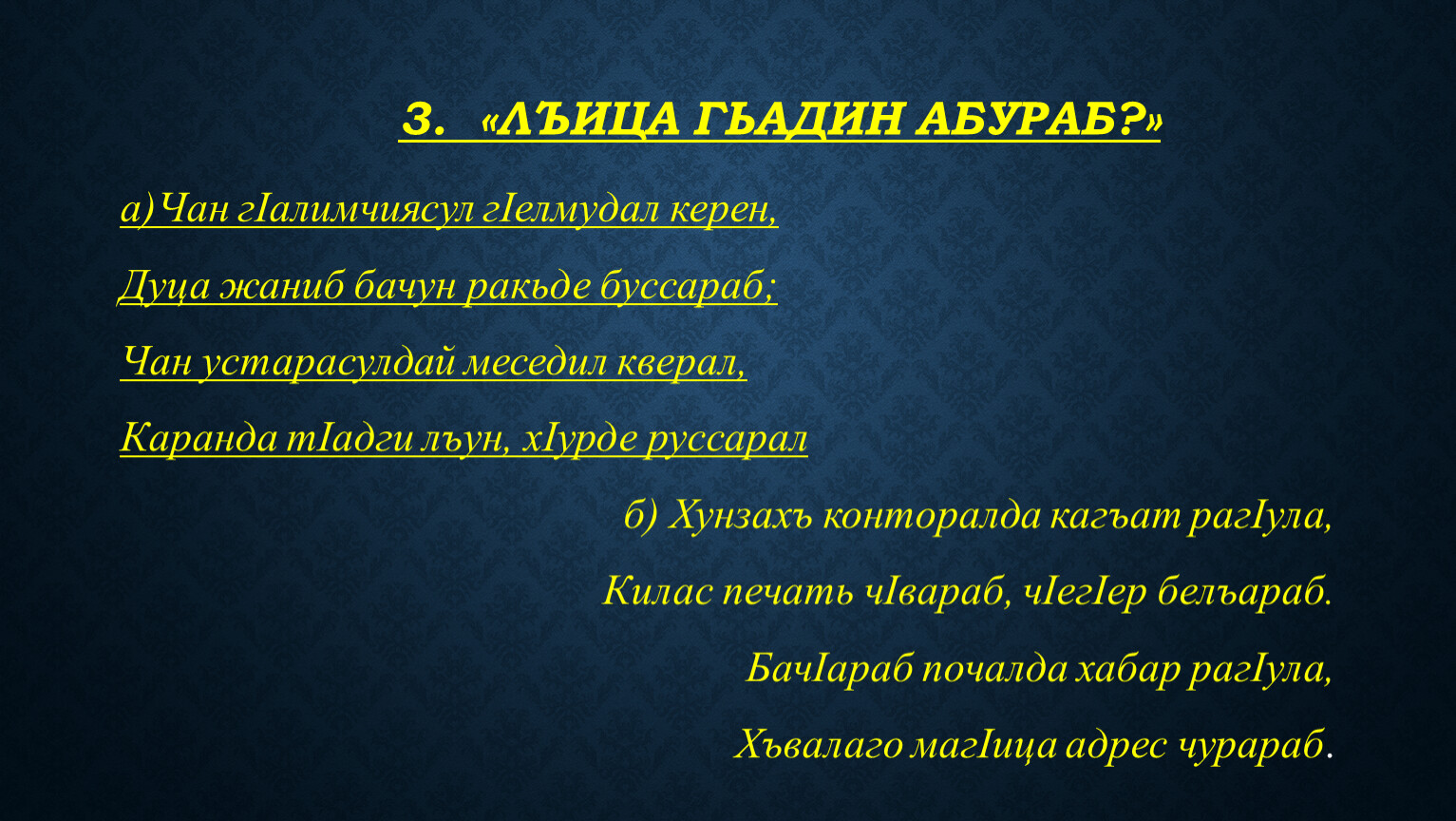 а)Ясалъ баргъич меседил гьабуна в)Хьитал салул цIуна