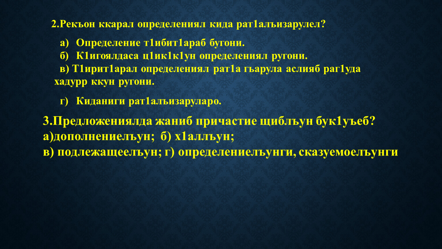 3.Предложениялда жаниб причастие щиблъун бук1уъеб?а)дополнениелъун; б) х1аллъун;