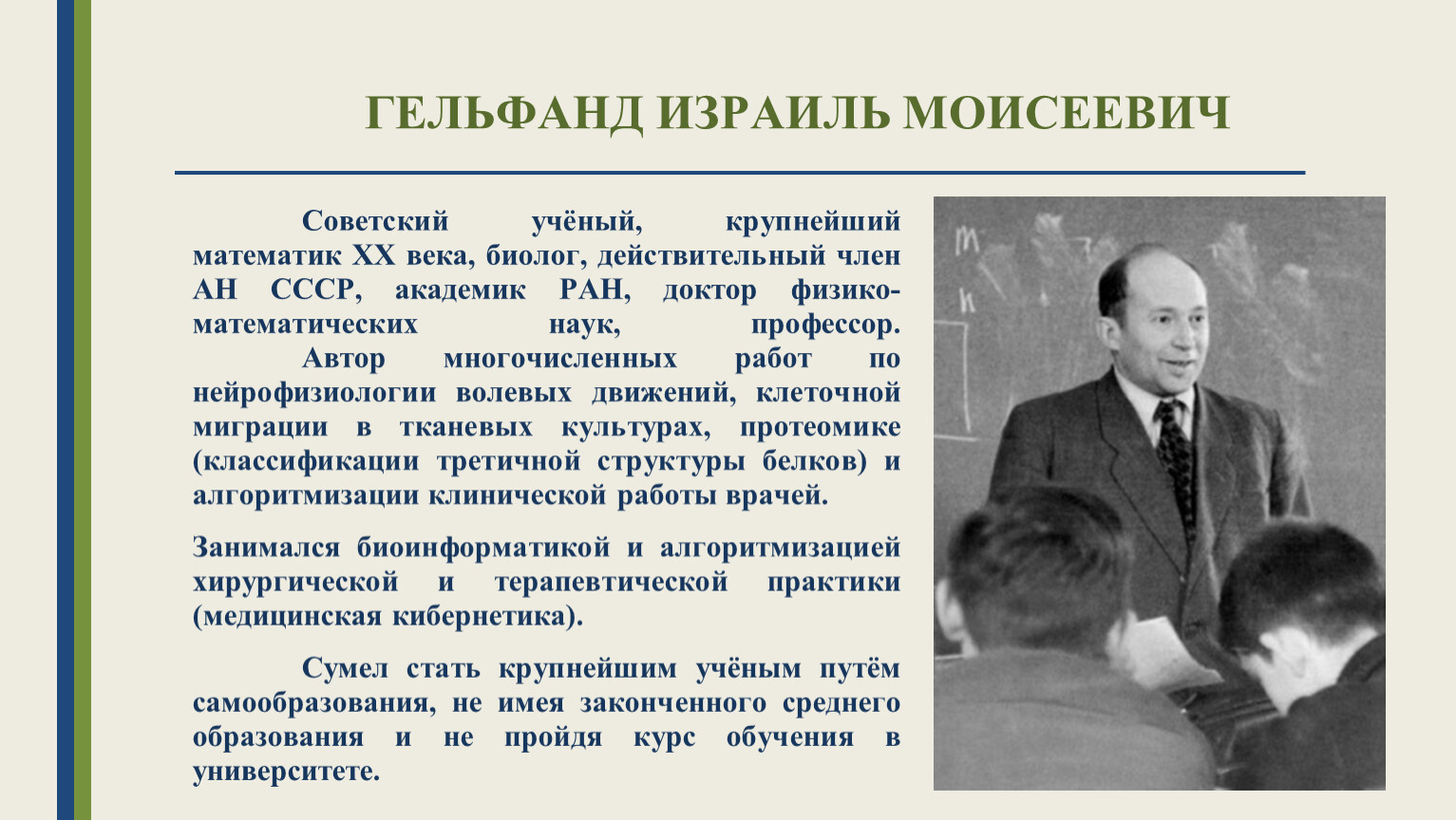 Советский учёный, крупнейший математик XX века, биолог, действительный член АН СССР, академик РАН, доктор физико-математических наук, профессор. Автор многочисленных работ по нейрофизиологии волевых движений, клеточной миграции в тканевых культурах, протеомике (классификации третичной структуры белков) и алгоритмизации клинической работы врачей.