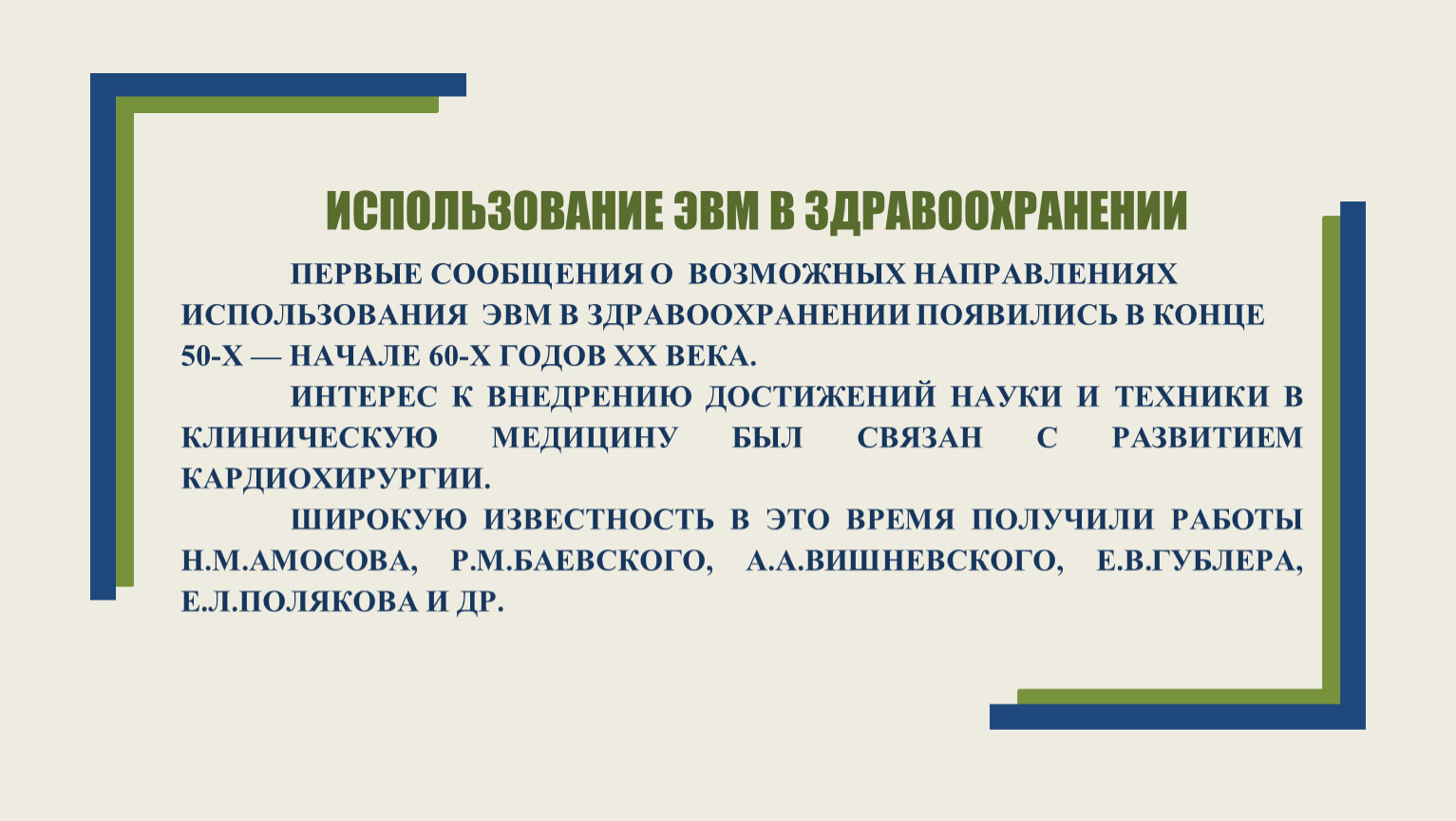 ПЕРВЫЕ СООБЩЕНИЯ О ВОЗМОЖНЫХ НАПРАВЛЕНИЯХ ИСПОЛЬЗОВАНИЯ ЭВМ В ЗДРАВООХРАНЕНИИ ПОЯВИЛИСЬ В КОНЦЕ 50-Х — НАЧАЛЕ 60-Х ГОДОВ ХХ ВЕКА.