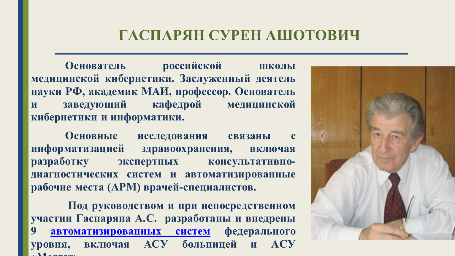 Основатель российской школы медицинской кибернетики. Заслуженный деятель науки РФ, академик МАИ, профессор. Основатель и заведующий кафедрой медицинской кибернетики и информатики.