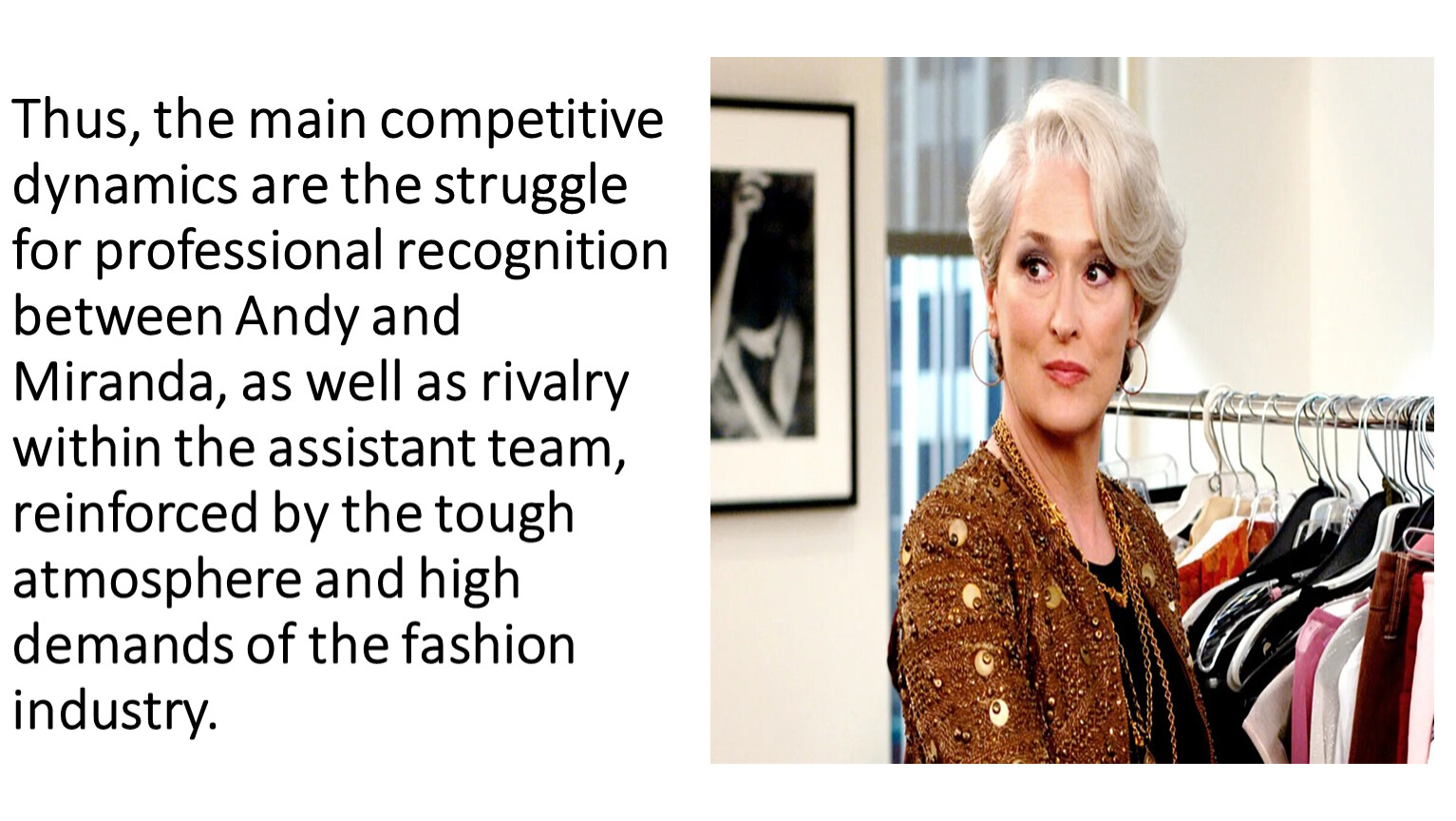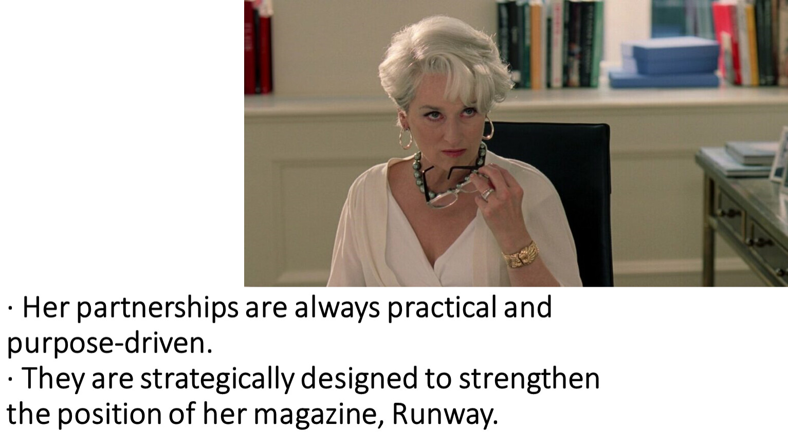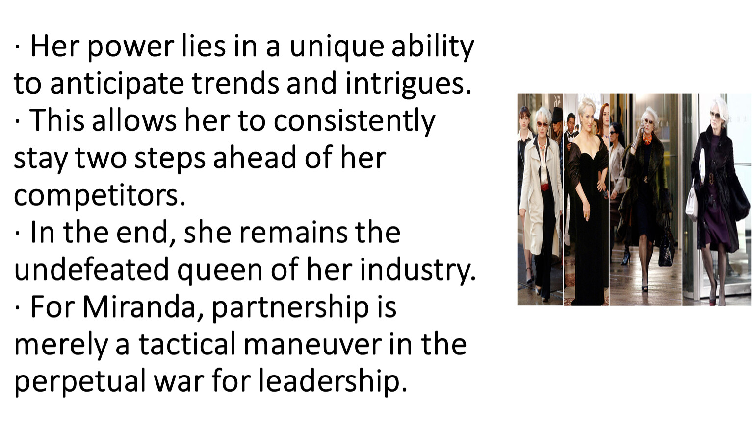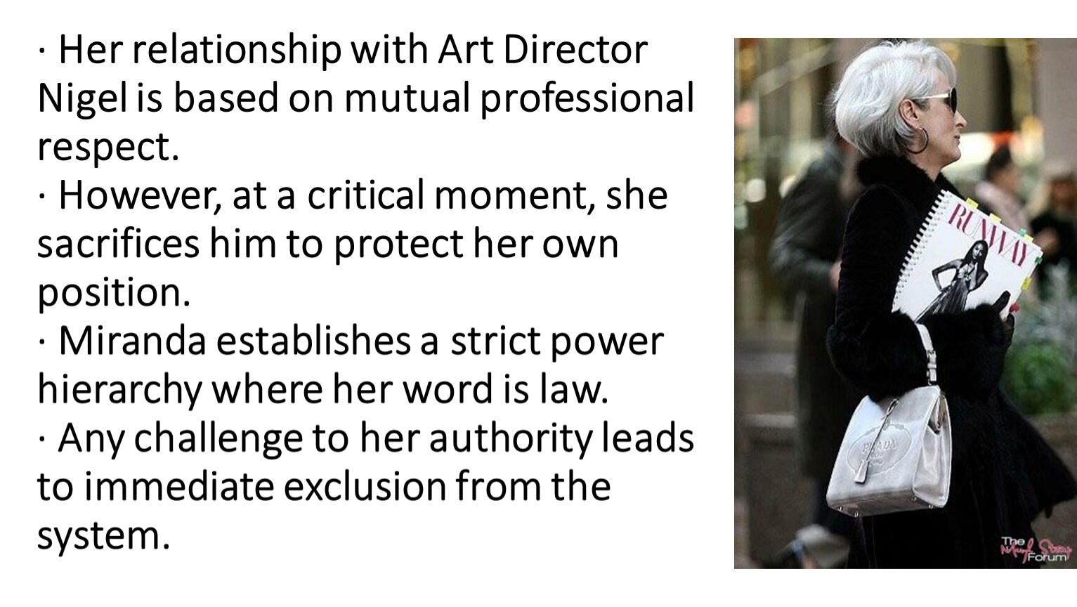 · Her relationship with Art Director Nigel is based on mutual professional respect.· However, at a critical moment, she sacrifices him to protect her own position.· Miranda establishes a strict power hierarchy where her word is law.· Any challenge to her authority leads to immediate exclusion from the system.