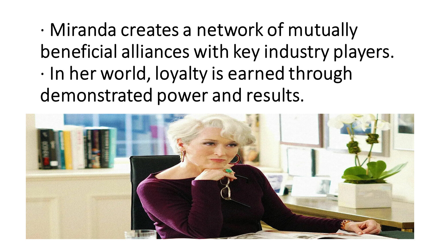 · Miranda creates a network of mutually beneficial alliances with key industry players.· In her world, loyalty is earned through demonstrated power and results.