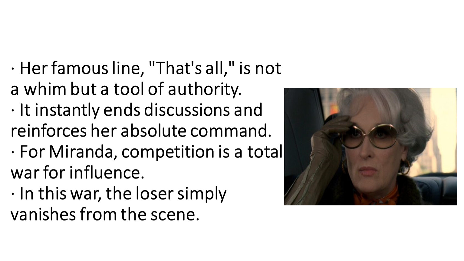 · Her famous line, "That's all," is not a whim but a tool of authority.· It instantly ends discussions and reinforces her absolute command.· For Miranda, competition is a total war for influence.· In this war, the loser simply vanishes from the scene.