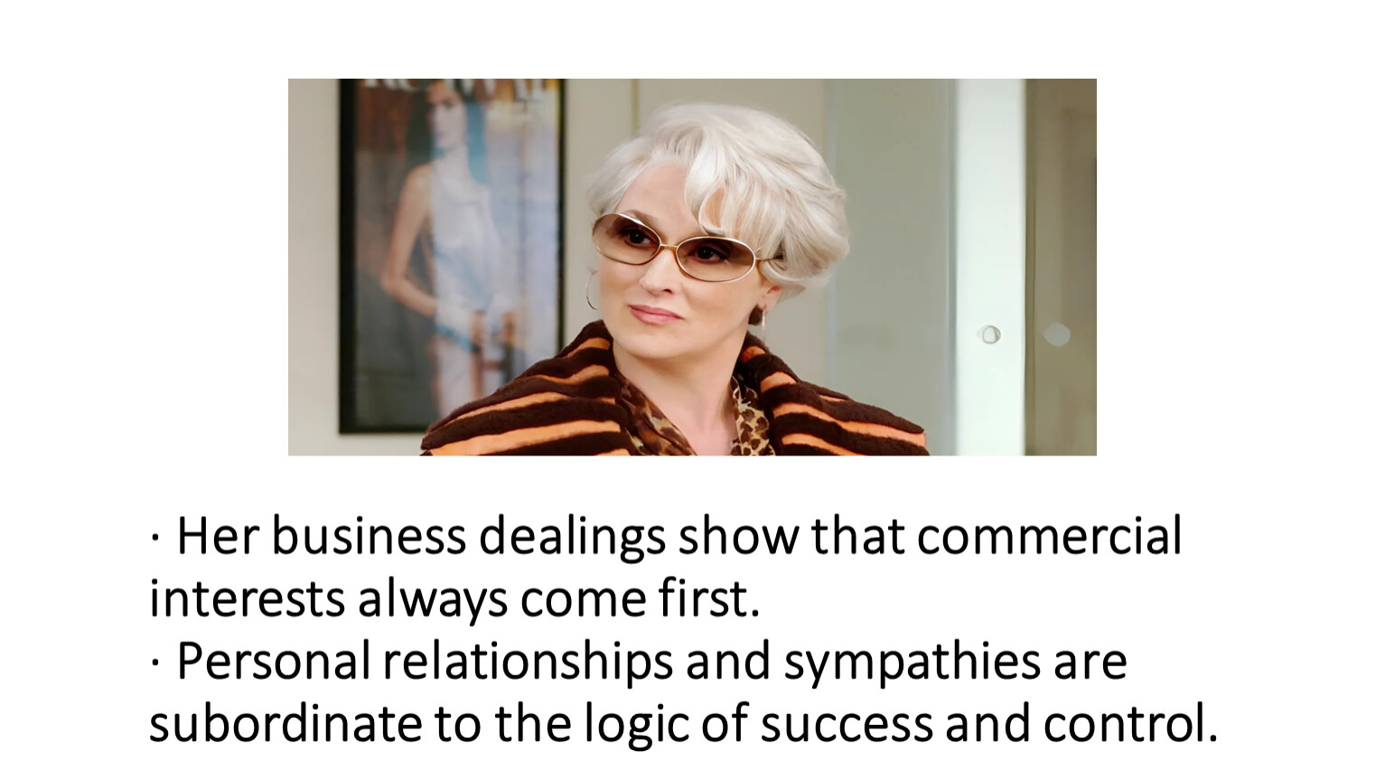 · Her business dealings show that commercial interests always come first.· Personal relationships and sympathies are subordinate to the logic of success and control.