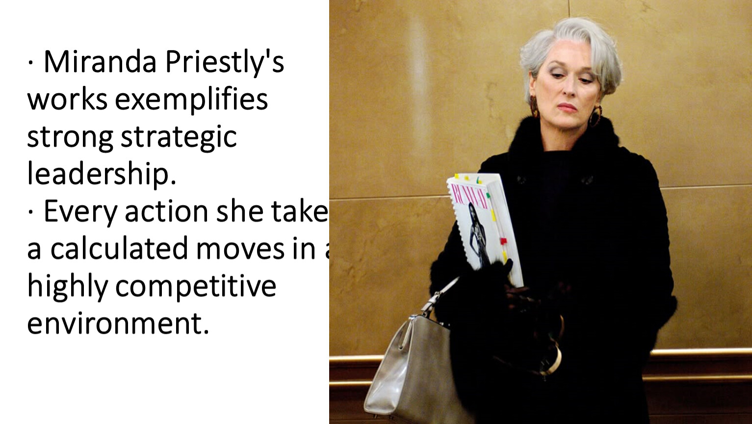 · Miranda Priestly's works exemplifies strong strategic leadership.· Every action she takes a calculated moves in a highly competitive environment.