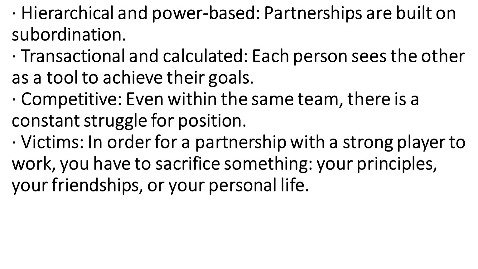 · Hierarchical and power-based: Partnerships are built on subordination.· Transactional and calculated: Each person sees the other as a tool to achieve their goals.· Competitive: Even within the same team, there is a constant struggle for position.· Victims: In order for a partnership with a strong player to work, you have to sacrifice something: your principles, your friendships, or your personal life.