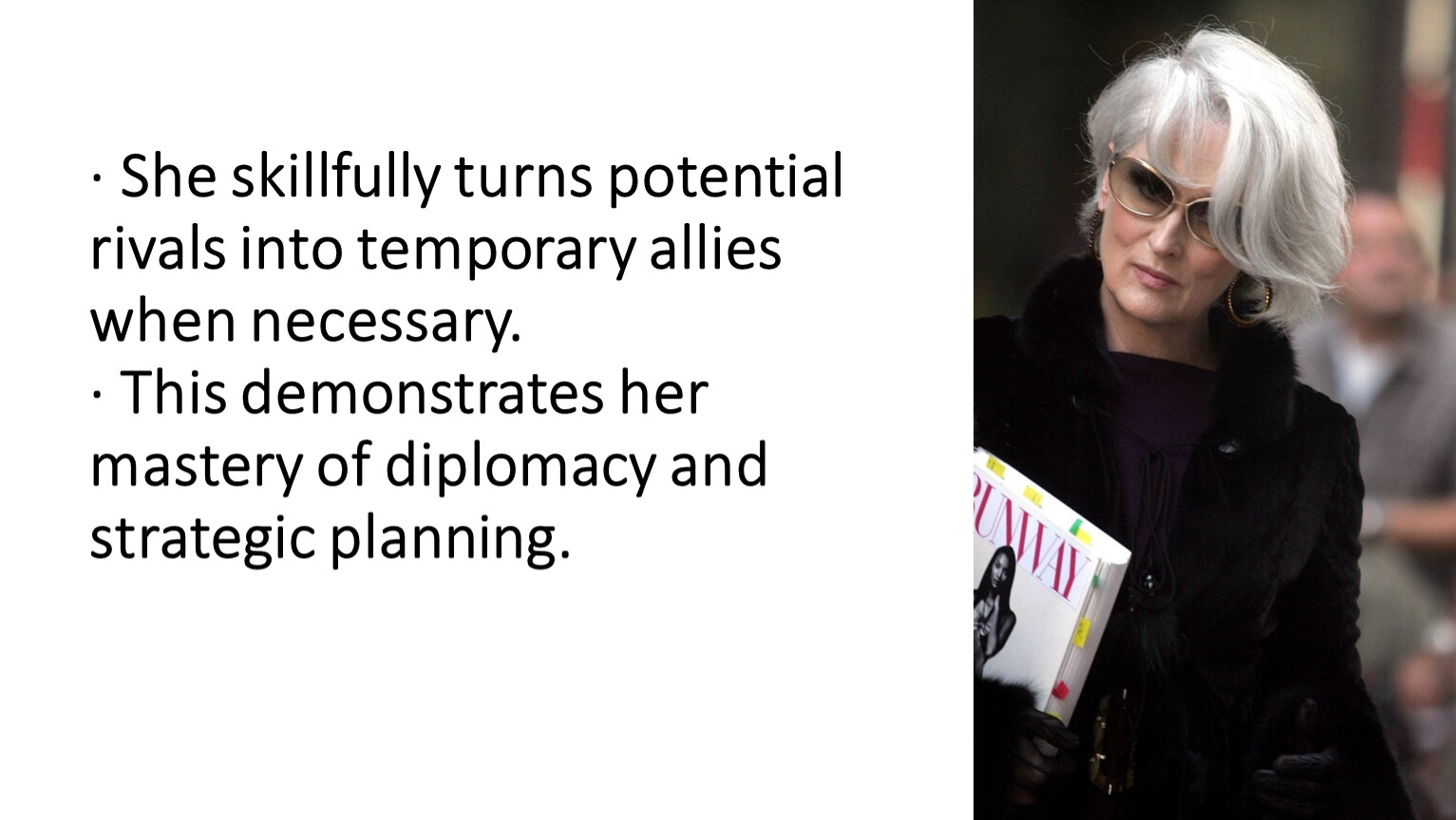 · She skillfully turns potential rivals into temporary allies when necessary.· This demonstrates her mastery of diplomacy and strategic planning.