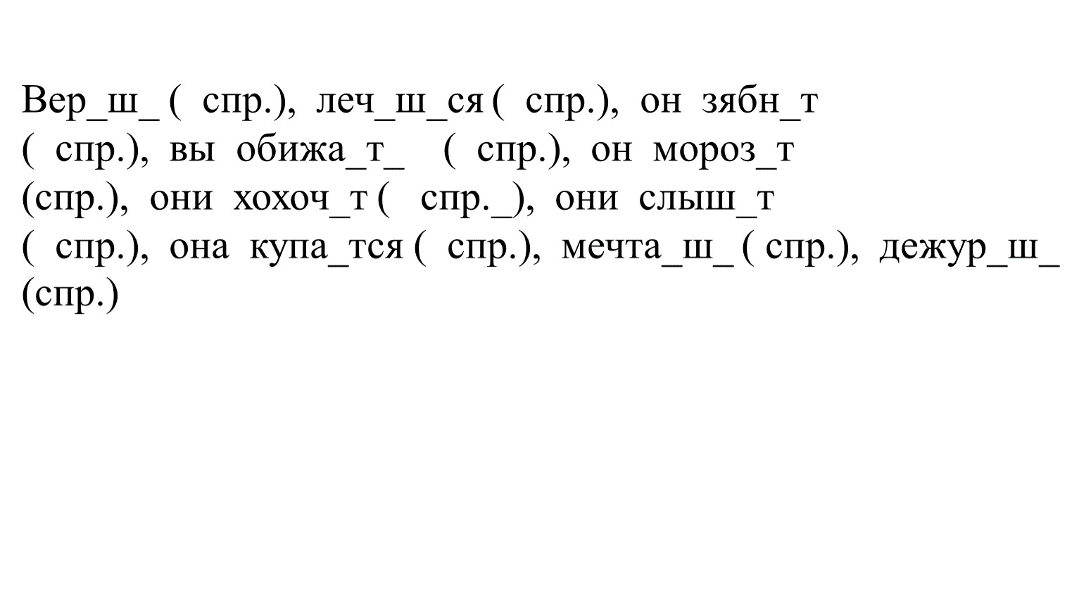 Вер_ш_ ( спр.), леч_ш_ся ( спр.), он зябн_т ( спр.), вы обижа_т_ ( спр.), он мороз_т (спр.), они хохоч_т ( спр._), они слыш_т ( спр.), она купа_тся ( спр.), мечта_ш_ ( спр.), дежур_ш_ (спр.)