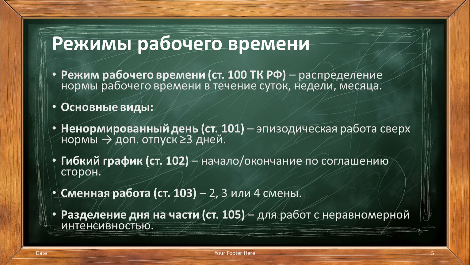 Режим рабочего времени (ст. 100 ТК РФ) – распределение нормы рабочего времени в течение суток, недели, месяца.