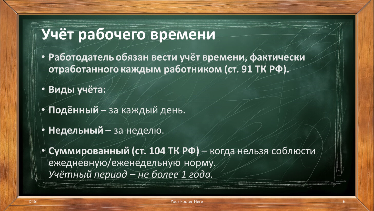Суммированный (ст. 104 ТК РФ) – когда нельзя соблюсти ежедневную/еженедельную норму.Учётный период – не более 1 года.