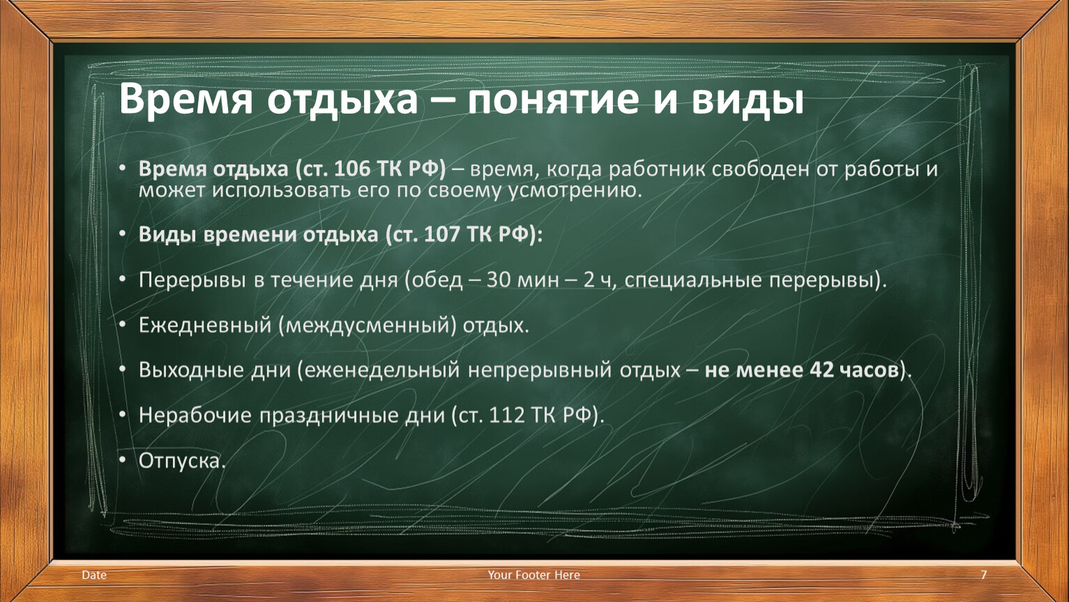 Время отдыха (ст. 106 ТК РФ) – время, когда работник свободен от работы и может использовать его по своему усмотрению.
