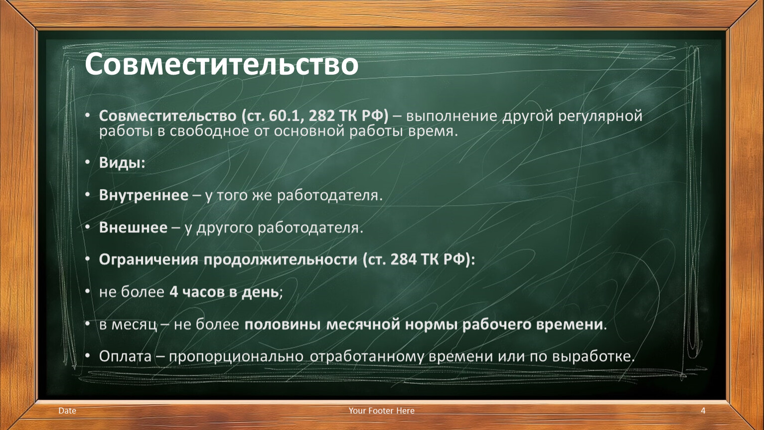 Совместительство (ст. 60.1, 282 ТК РФ) – выполнение другой регулярной работы в свободное от основной работы время.