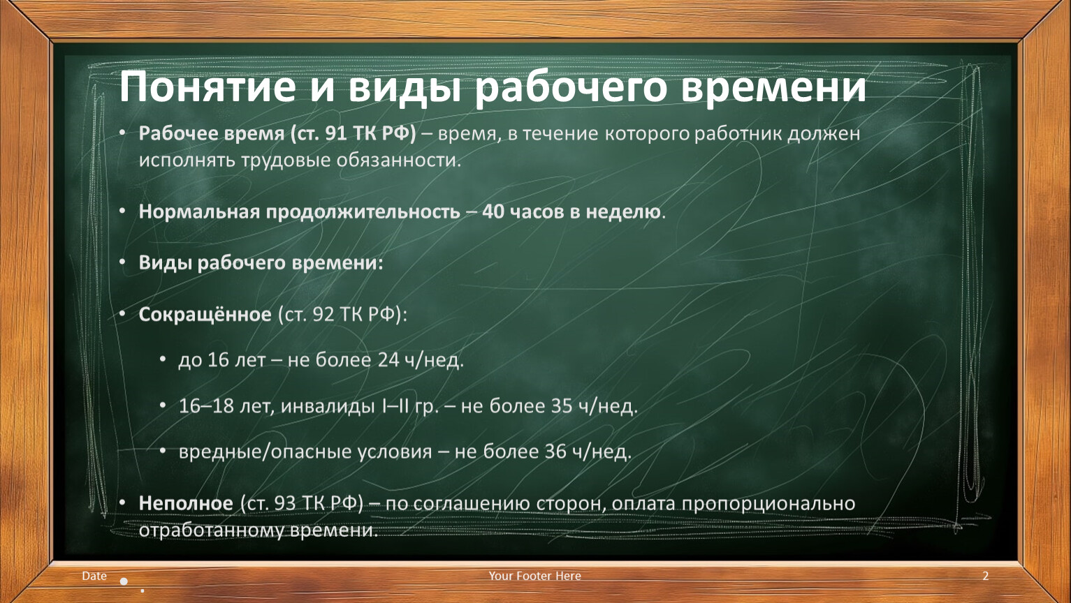Рабочее время (ст. 91 ТК РФ) – время, в течение которого работник должен исполнять трудовые обязанности.