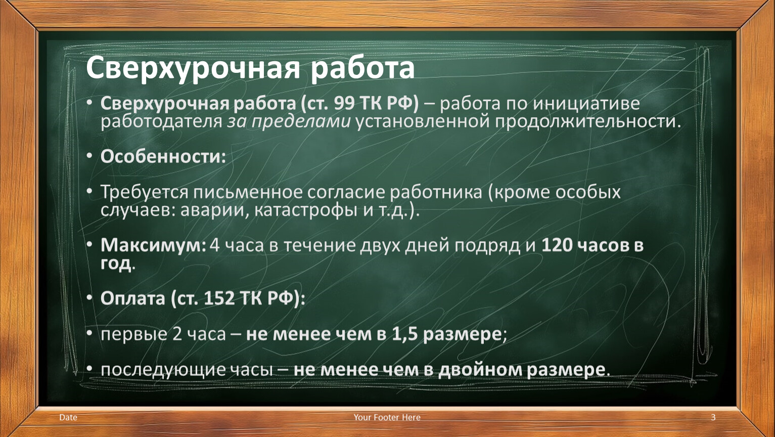 Сверхурочная работа (ст. 99 ТК РФ) – работа по инициативе работодателя за пределами установленной продолжительности.