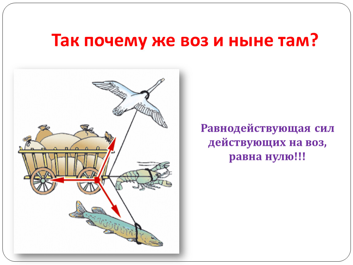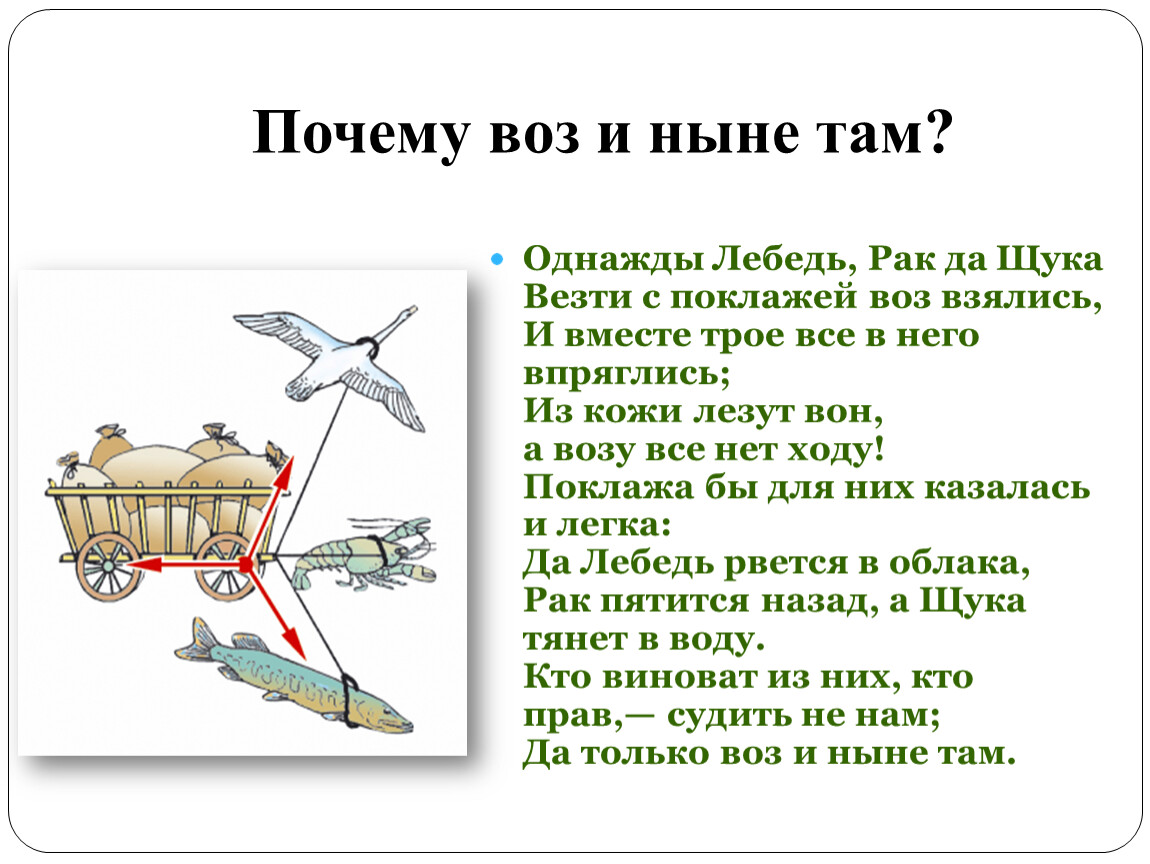 Однажды Лебедь, Рак да ЩукаВезти с поклажей воз взялись, И вместе трое все в него впряглись; Из кожи лезут вон, а возу все нет ходу! Поклажа бы для них казалась и легка:Да Лебедь рвется в облака, Рак пятится назад, а Щука тянет в воду. Кто виноват из них, кто прав,— судить не нам;Да только воз и ныне там.