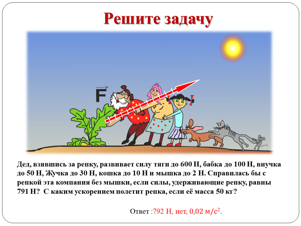 Дед, взявшись за репку, развивает силу тяги до 600 Н, бабка до 100 Н, внучка до 50 Н, Жучка до 30 Н, кошка до 10 Н и мышка до 2 Н. Справилась бы с репкой эта компания без мышки, если силы, удерживающие репку, равны 791 Н? С каким ускорением полетит репка, если её масса 50 кг?