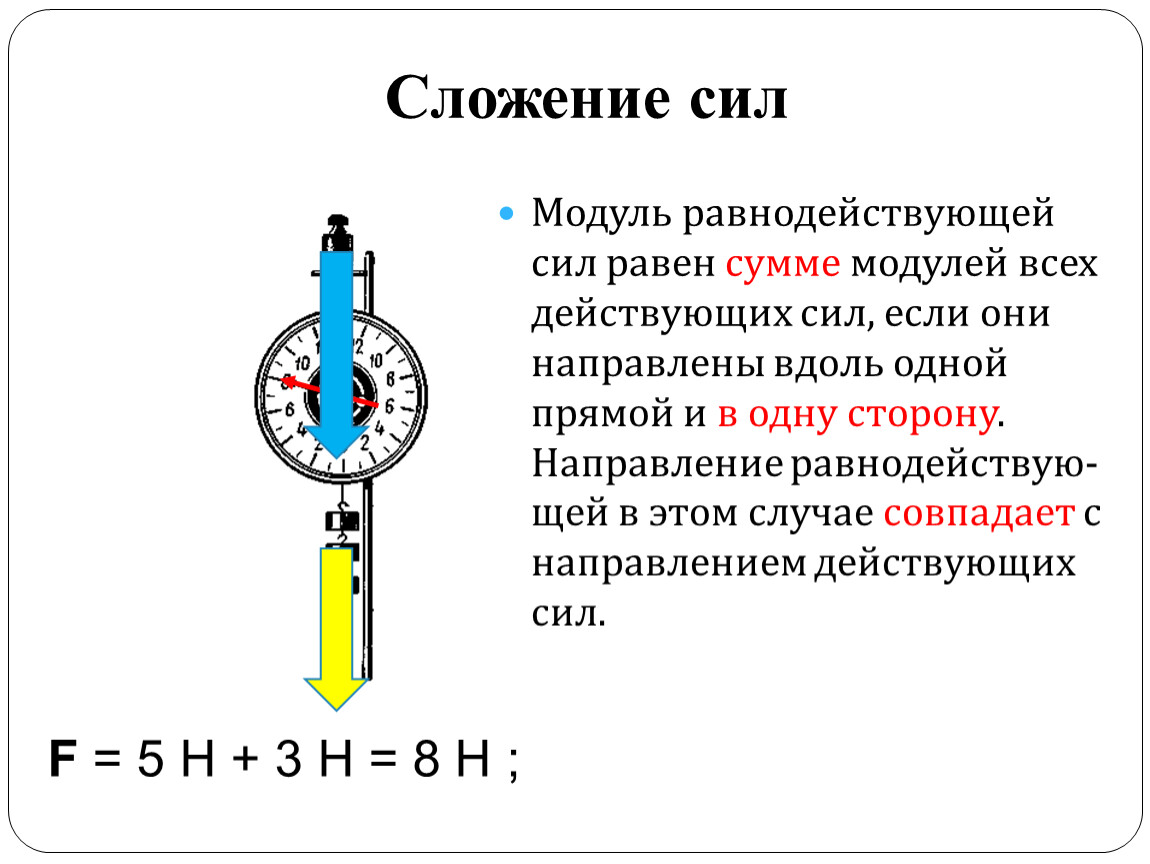 Модуль равнодействующей сил равен сумме модулей всех действующих сил, если они направлены вдоль одной прямой и в одну сторону. Направление равнодействую-щей в этом случае совпадает с направлением действующих сил.