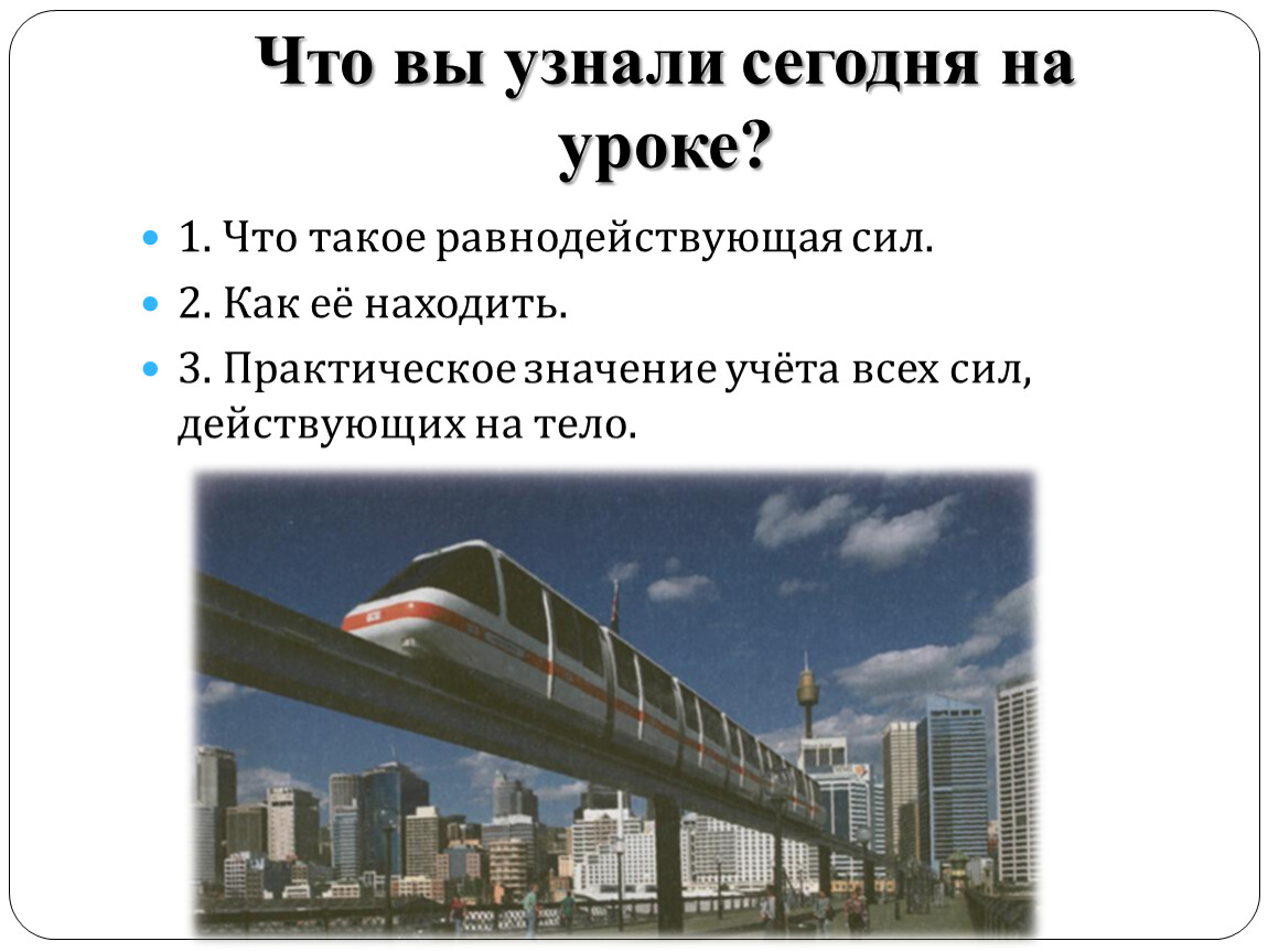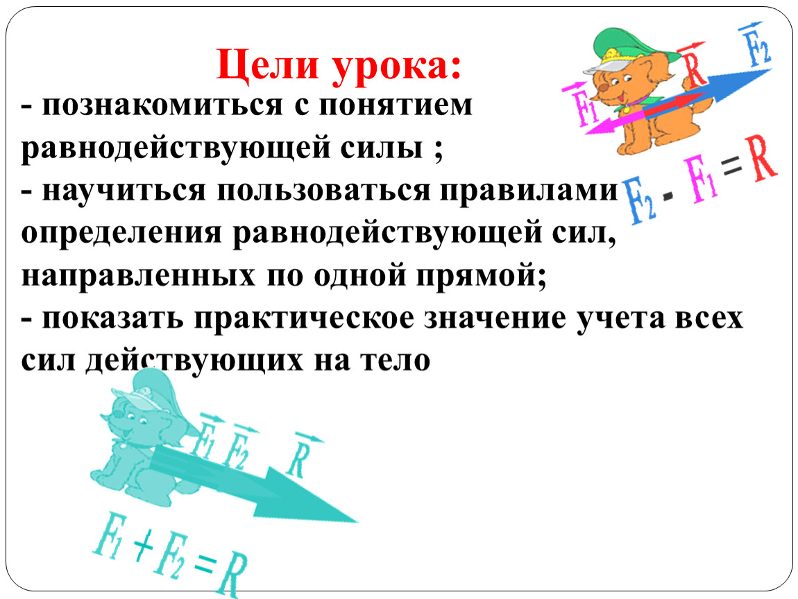 - познакомиться с понятием равнодействующей силы ;- научиться пользоваться правилами определения равнодействующей сил, направленных по одной прямой; - показать практическое значение учета всех сил действующих на тело