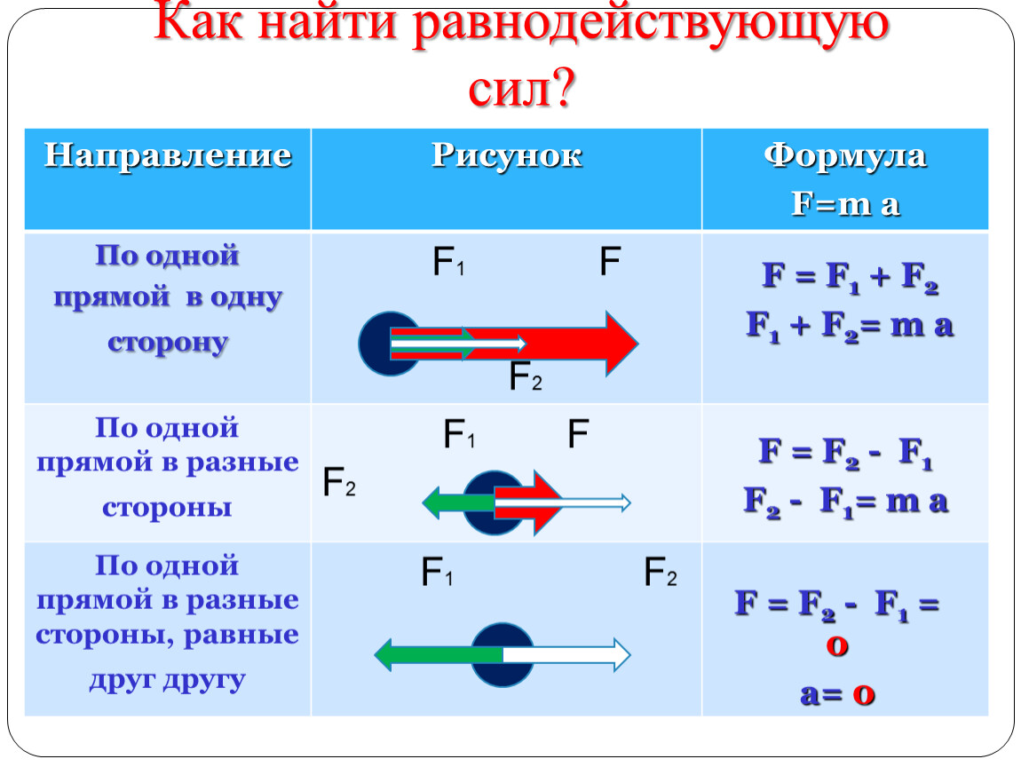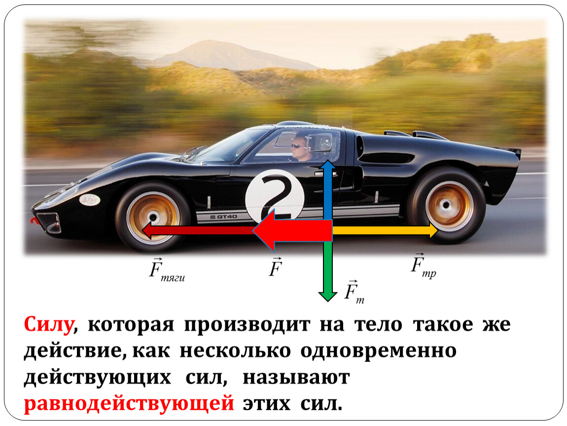 Силу, которая производит на тело такое же действие, как несколько одновременно действующих сил, называют равнодействующей этих сил.