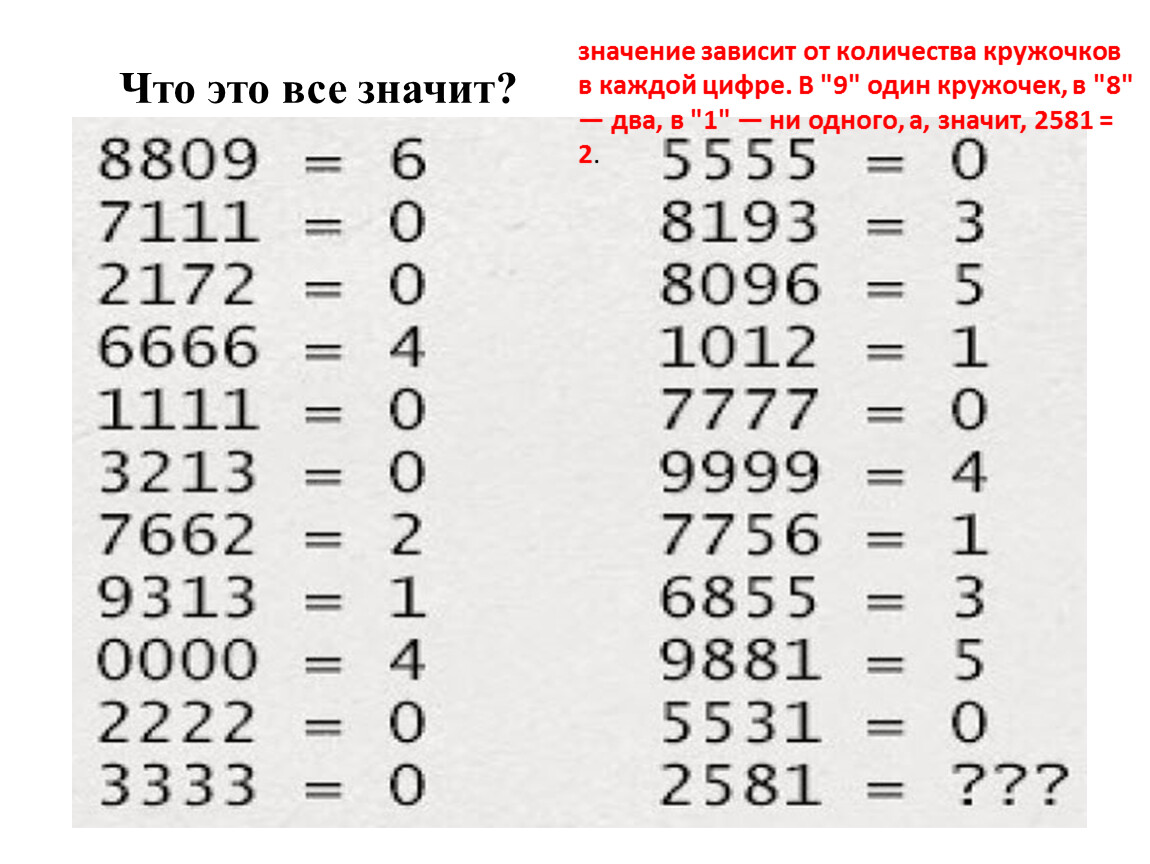 значение зависит от количества кружочков в каждой цифре. В "9" один кружочек, в "8" — два, в "1" — ни одного, а, значит, 2581 = 2.