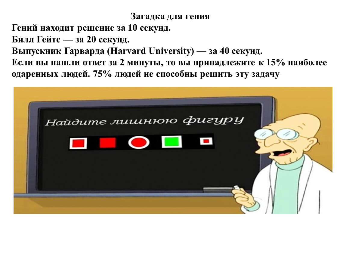 Если вы нашли ответ за 2 минуты, то вы принадлежите к 15% наиболее одаренных людей. 75% людей не способны решить эту задачу