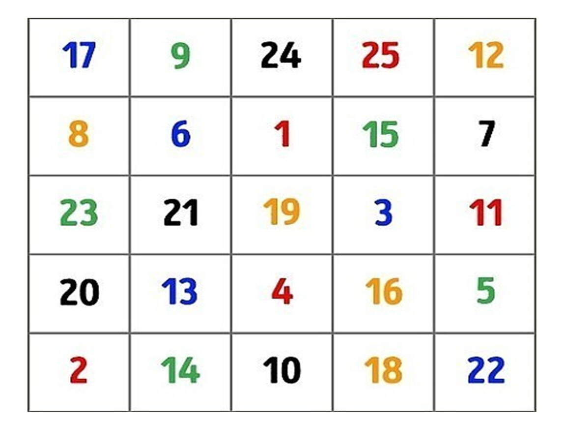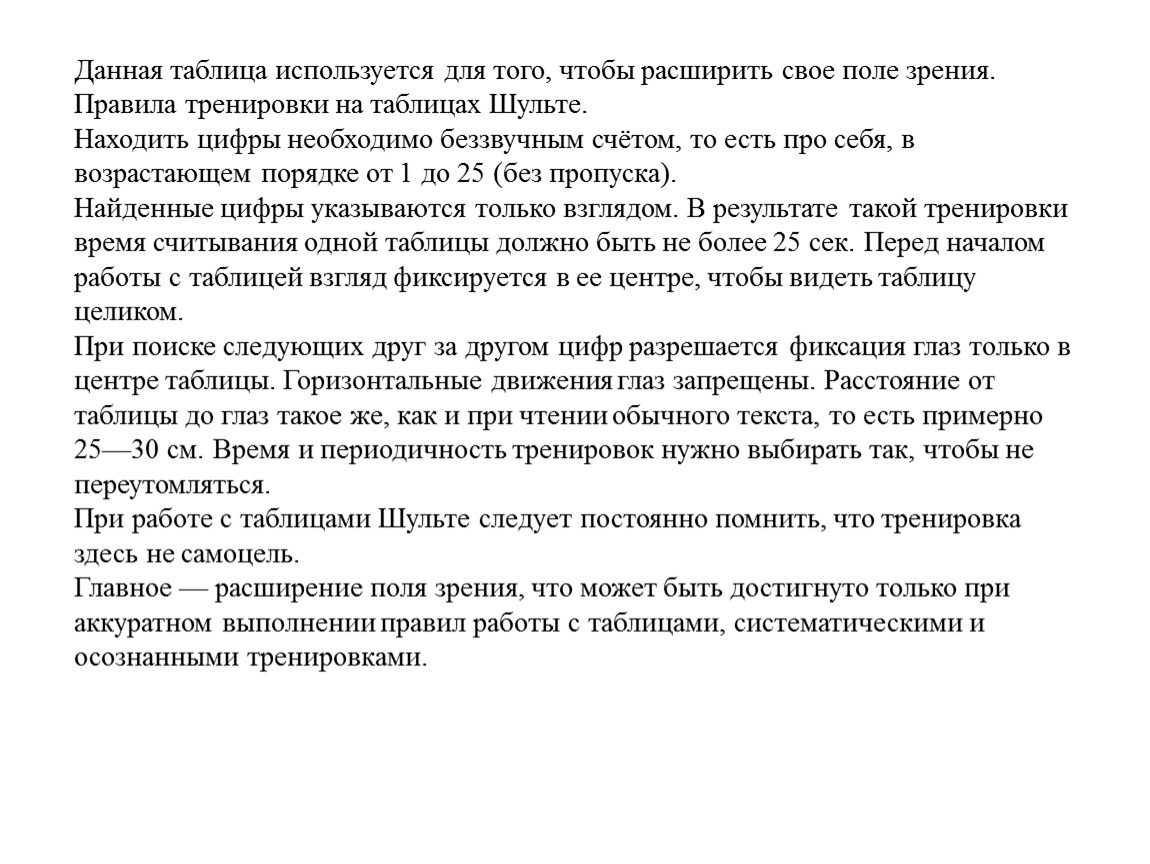 Данная таблица используется для того, чтобы расширить свое поле зрения. Правила тренировки на таблицах Шульте. Находить цифры необходимо беззвучным счётом, то есть про себя, в возрастающем порядке от 1 до 25 (без пропуска). Найденные цифры указываются только взглядом. В результате такой тренировки время считывания одной таблицы должно быть не более 25 сек. Перед началом работы с таблицей взгляд фиксируется в ее центре, чтобы видеть таблицу целиком. При поиске следующих друг за другом цифр разрешается фиксация глаз только в центре таблицы. Горизонтальные движения глаз запрещены. Расстояние от таблицы до глаз такое же, как и при чтении обычного текста, то есть примерно 25—30 см. Время и периодичность тренировок нужно выбирать так, чтобы не переутомляться. При работе с таблицами Шульте следует постоянно помнить, что тренировка здесь не самоцель. Главное — расширение поля зрения, что может быть достигнуто только при аккуратном выполнении правил работы с таблицами, систематическими и осознанными тренировками.