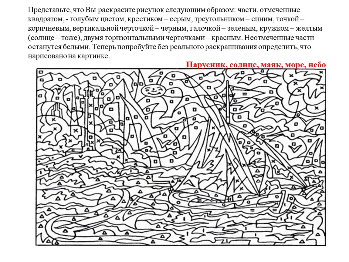 Представьте, что Вы раскрасите рисунок следующим образом: части, отмеченные квадратом, - голубым цветом, крестиком – серым, треугольником – синим, точкой – коричневым, вертикальной черточкой – черным, галочкой – зеленым, кружком – желтым (солнце – тоже), двумя горизонтальными черточками – красным. Неотмеченные части останутся белыми. Теперь попробуйте без реального раскрашивания определить, что нарисовано на картинке.