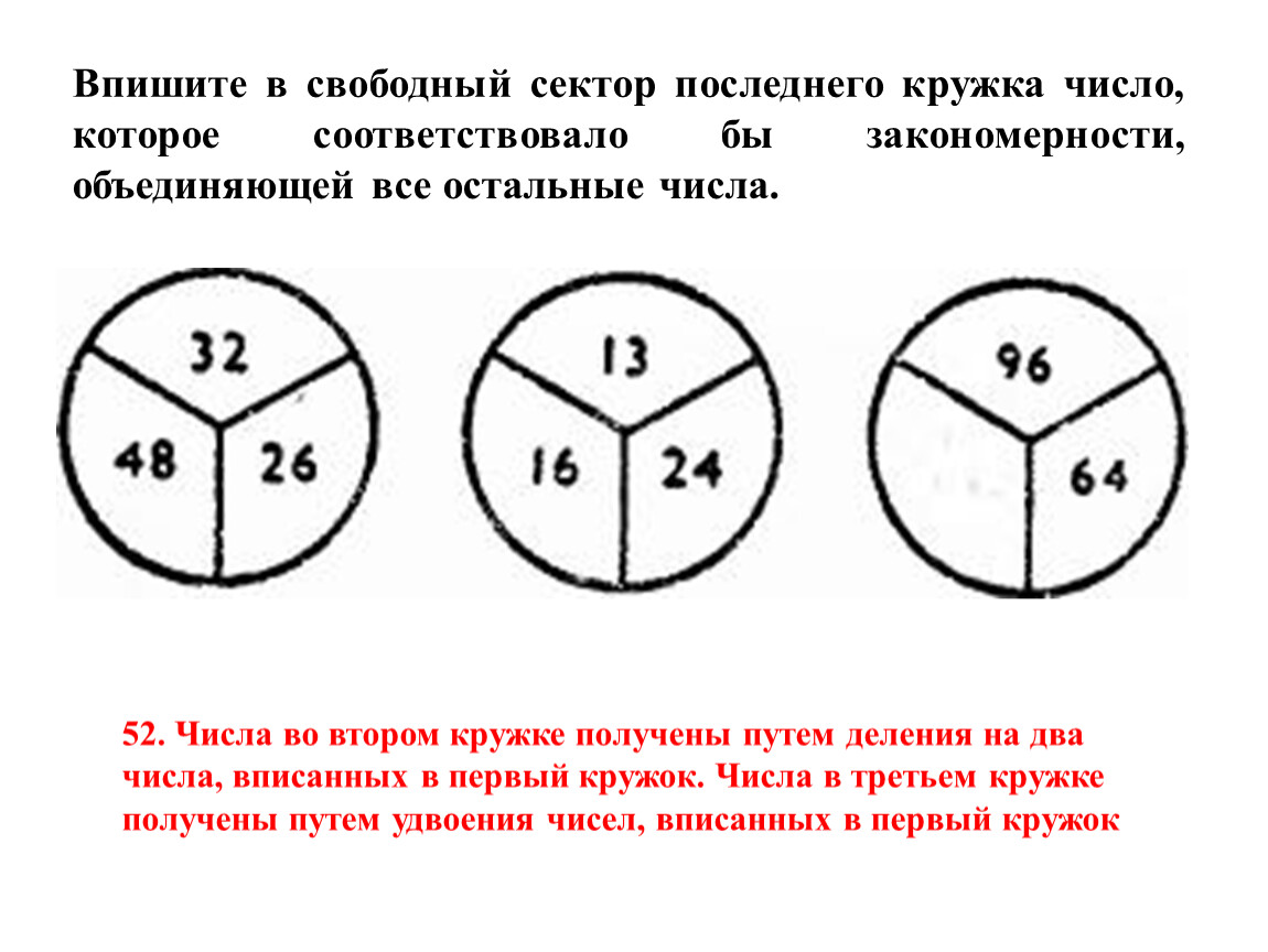 52. Числа во втором кружке получены путем деления на два числа, вписанных в первый кружок. Числа в третьем кружке получены путем удвоения чисел, вписанных в первый кружок