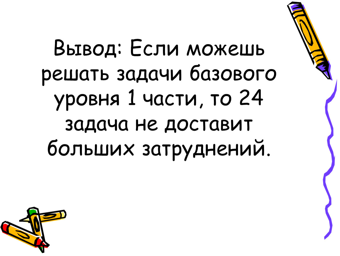 Вывод: Если можешь решать задачи базового уровня 1 части, то 24 задача не доставит больших затруднений.