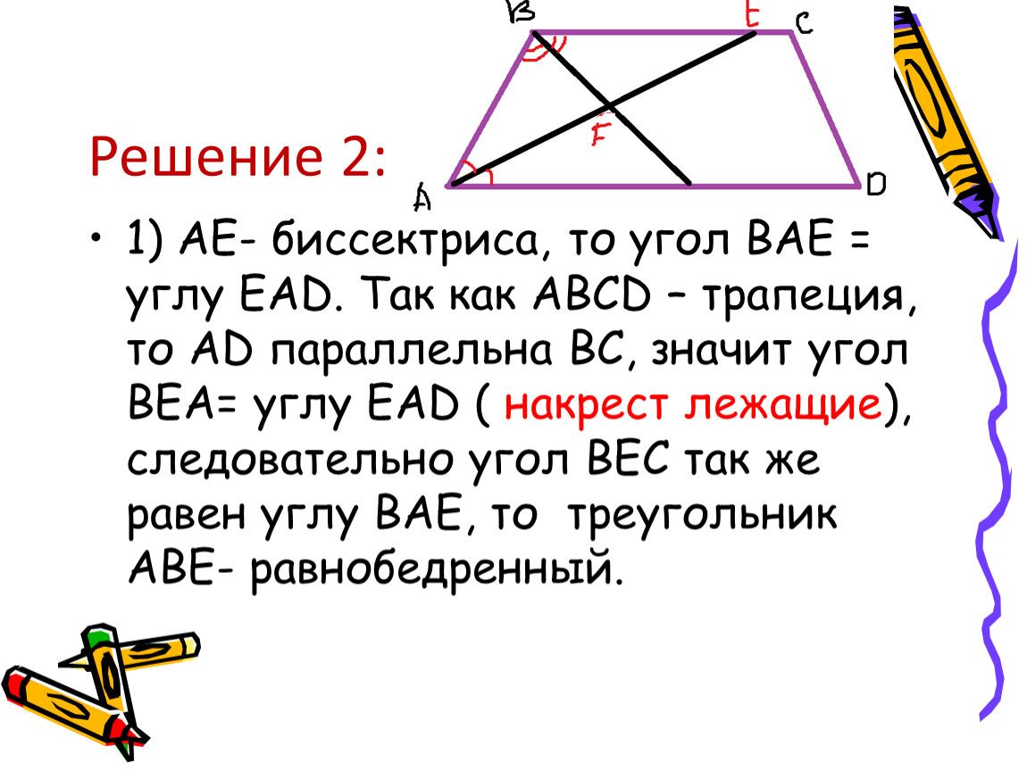 1) АЕ- биссектриса, то угол ВАЕ = углу ЕАD. Так как ABCD – трапеция, то АD параллельна ВС, значит угол ВЕА= углу ЕАD ( накрест лежащие), следовательно угол ВЕС так же равен углу ВАЕ, то треугольник АВЕ- равнобедренный.