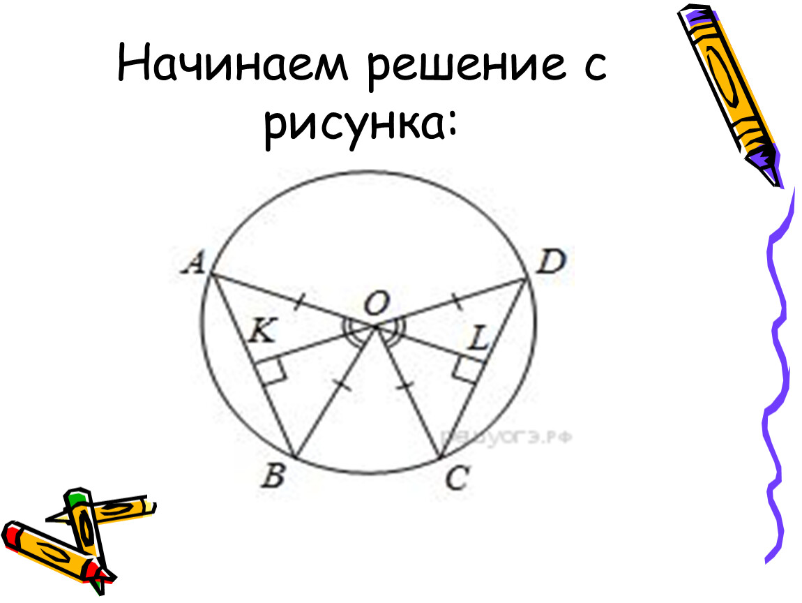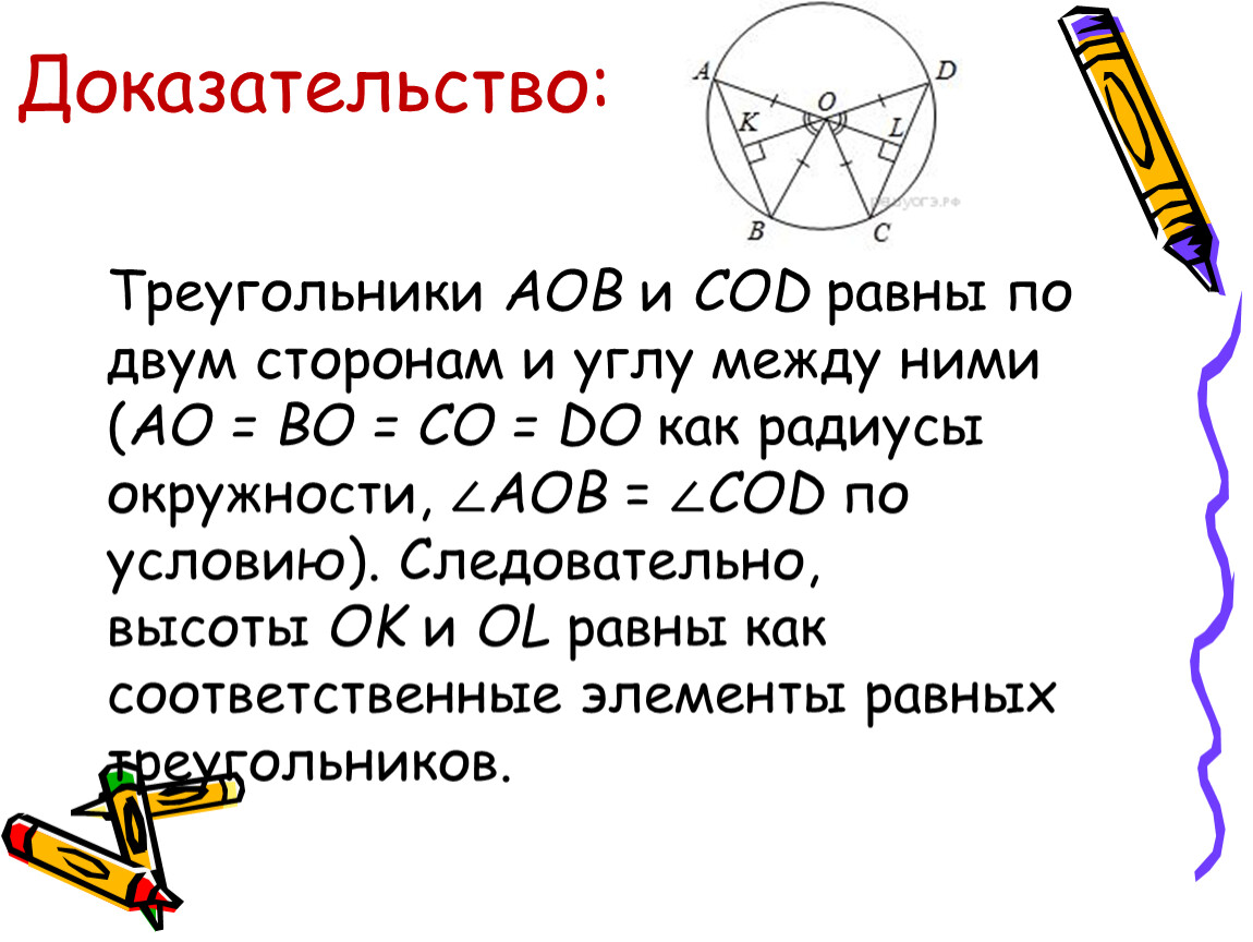 В окружности с центром О проведены две хорды АВ и CD так, что центральные углы АОВ и СОD равны. На эти хорды опущены перпендикуляры ОК и OL. Докажите, что ОК и OL равны.