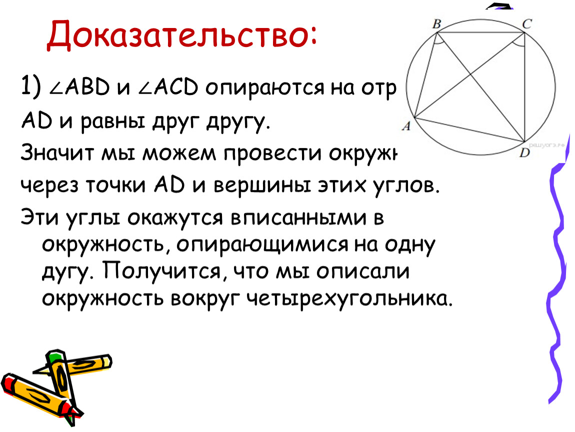 Эти углы окажутся вписанными в окружность, опирающимися на одну дугу. Получится, что мы описали окружность вокруг четырехугольника.