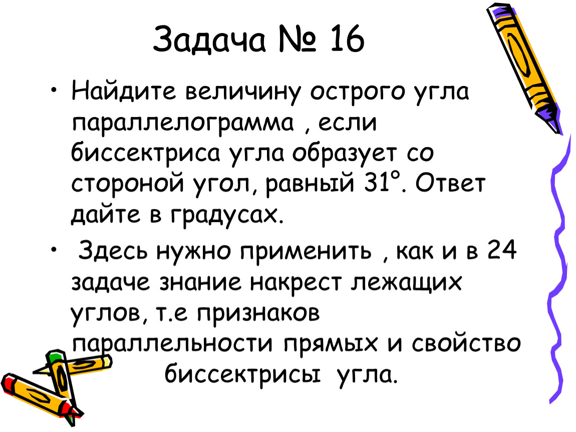 Здесь нужно применить , как и в 24 задаче знание накрест лежащих углов, т.е признаков параллельности прямых и свойство биссектрисы угла.