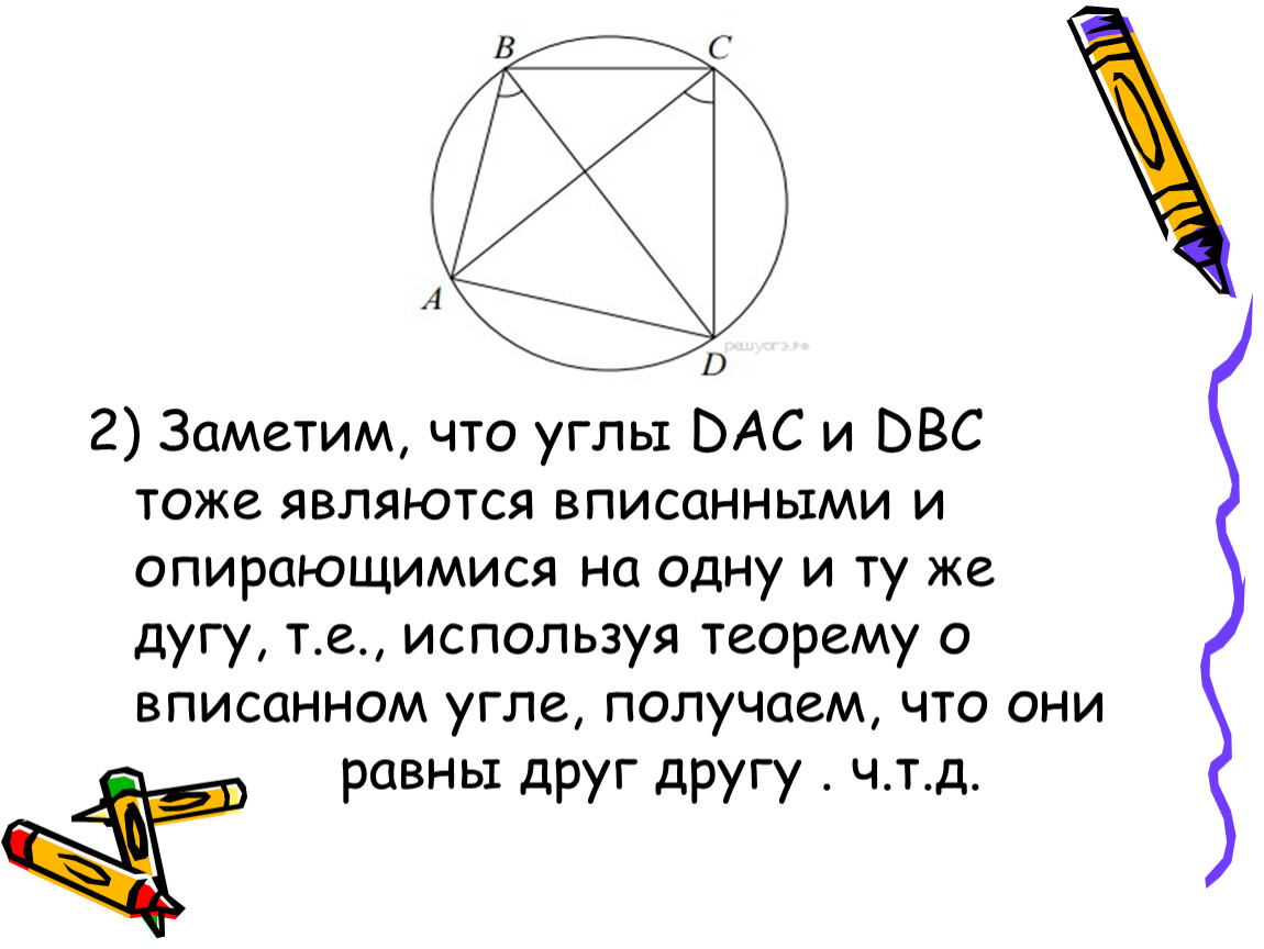 2) Заметим, что углы DAC и DBC тоже являются вписанными и опирающимися на одну и ту же дугу, т.е., используя теорему о вписанном угле, получаем, что они равны друг другу . ч.т.д.
