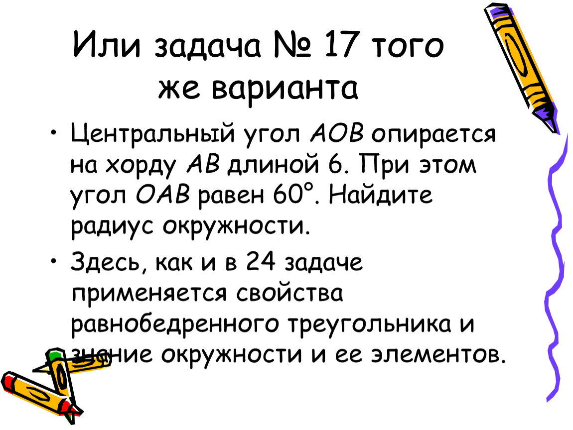 Здесь, как и в 24 задаче применяется свойства равнобедренного треугольника и знание окружности и ее элементов.