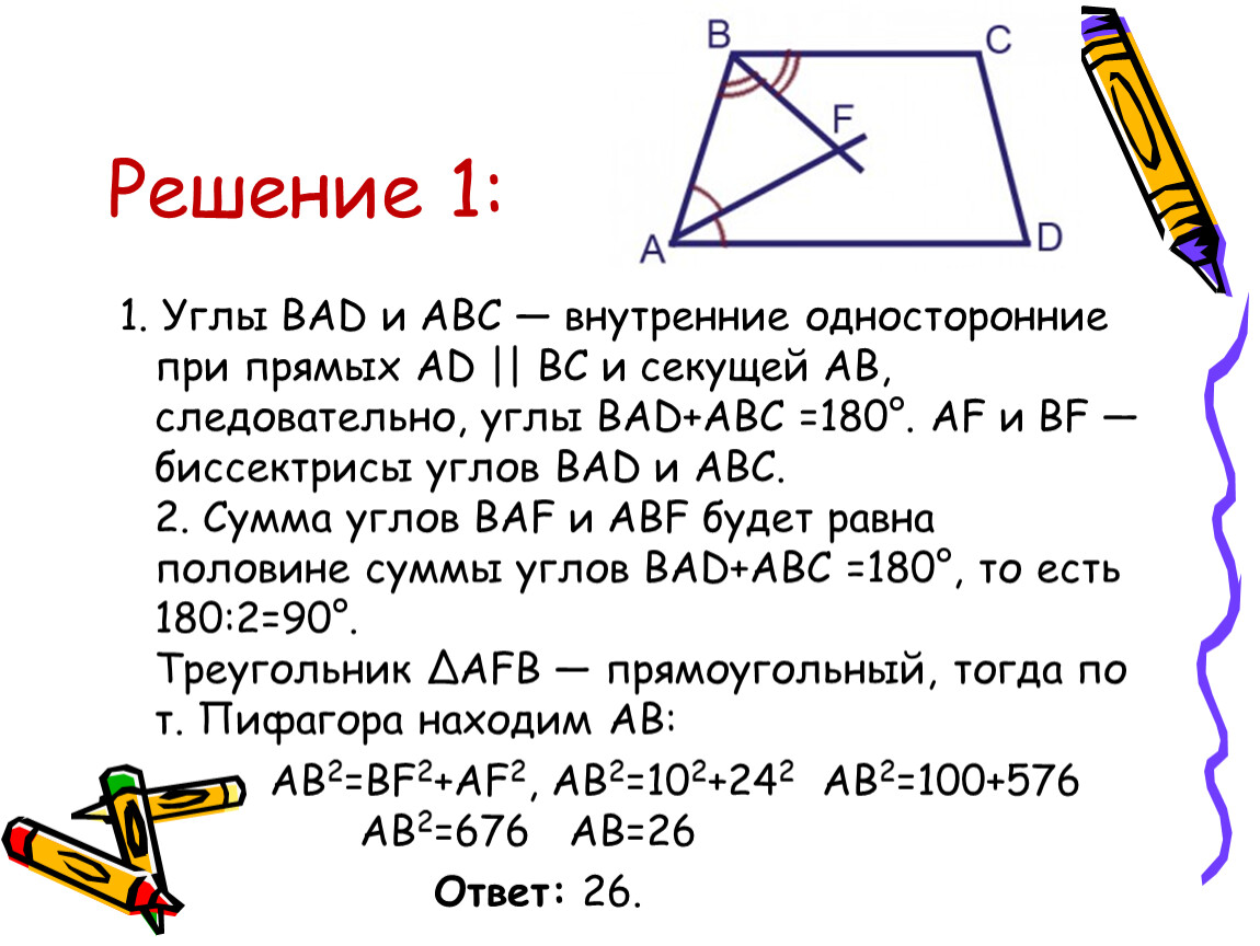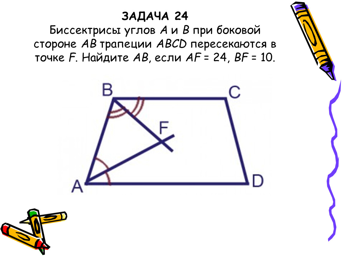 ЗАДАЧА 24 Биссектрисы углов A и B при боковой стороне AB трапеции ABCD пересекаются в точке F. Найдите AB, если AF = 24, BF = 10.