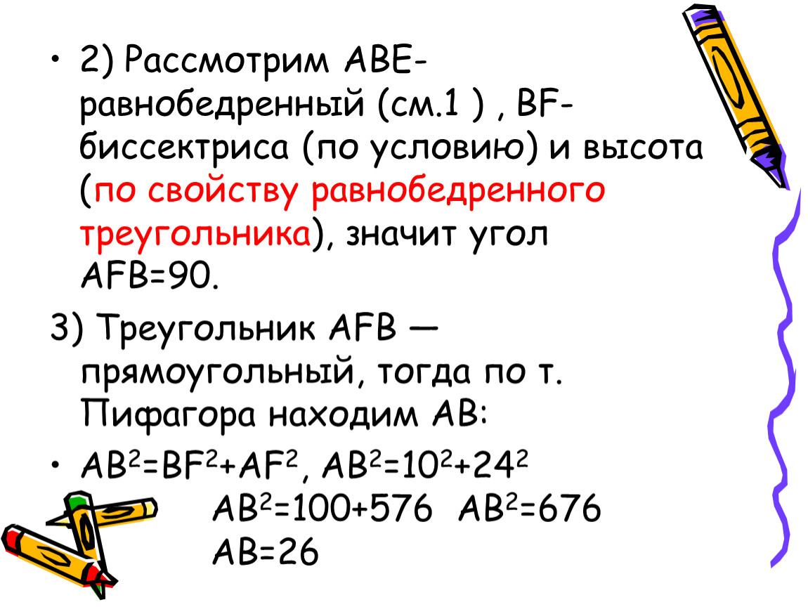 3) Треугольник AFB — прямоугольный, тогда по т. Пифагора находим AB:
