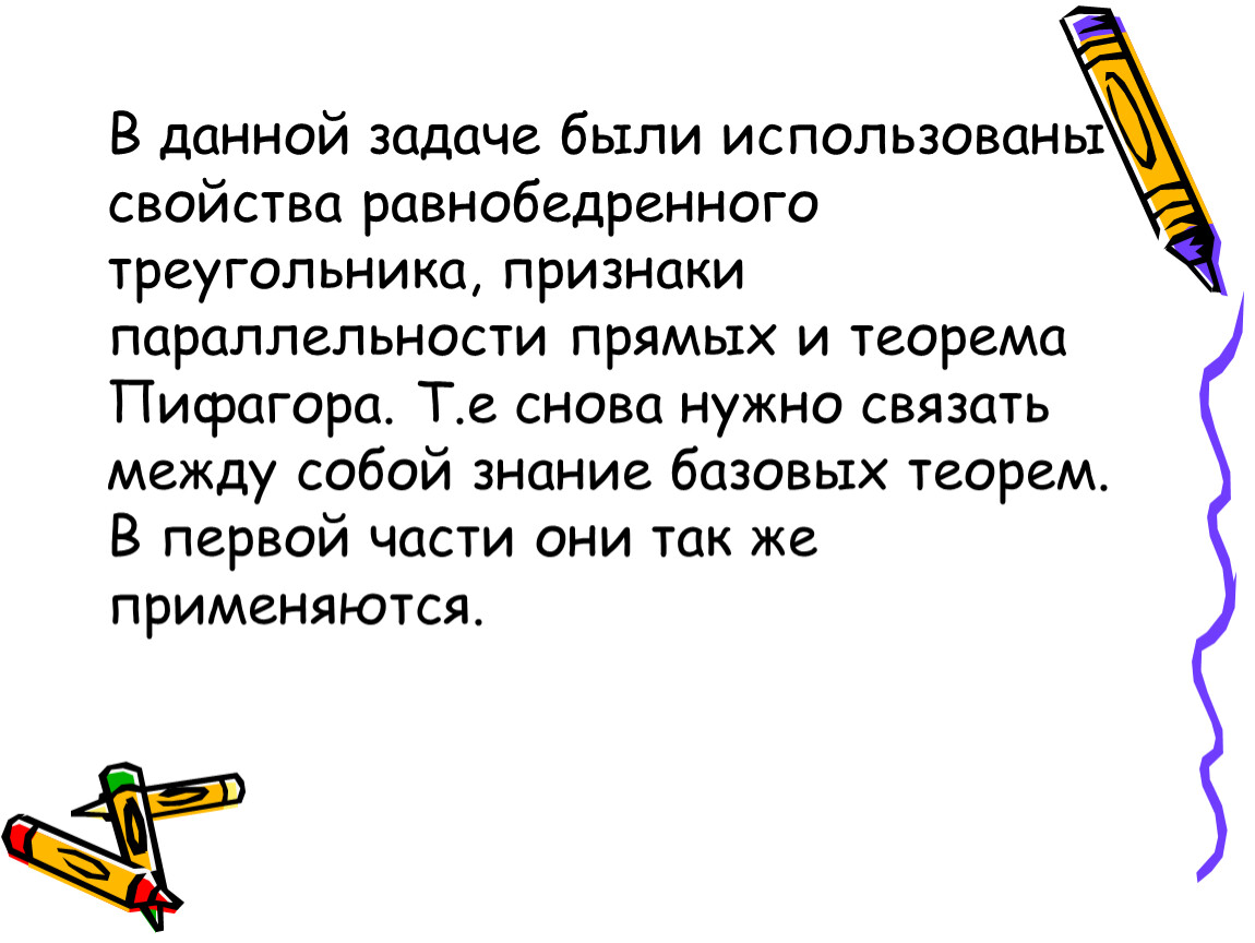 В данной задаче были использованы свойства равнобедренного треугольника, признаки параллельности прямых и теорема Пифагора. Т.е снова нужно связать между собой знание базовых теорем. В первой части они так же применяются.