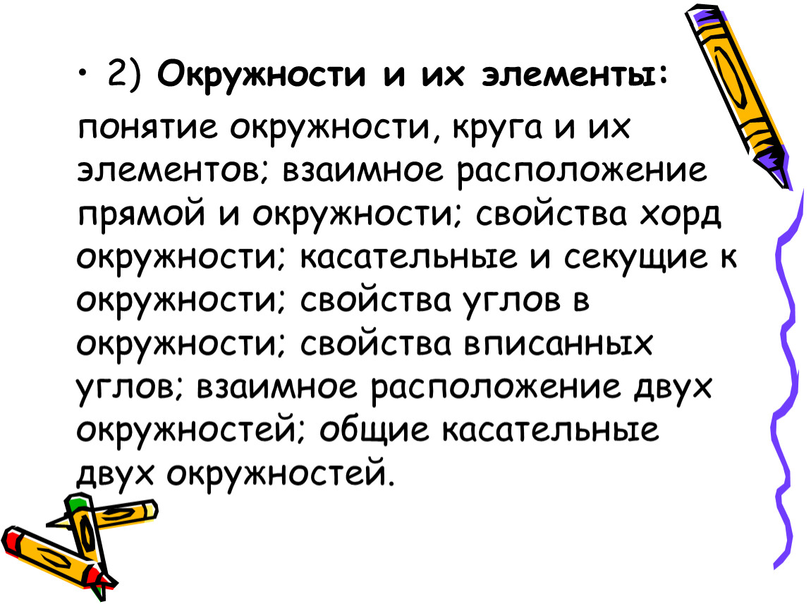 понятие окружности, круга и их элементов; взаимное расположение прямой и окружности; свойства хорд окружности; касательные и секущие к окружности; свойства углов в окружности; свойства вписанных углов; взаимное расположение двух окружностей; общие касательные двух окружностей.