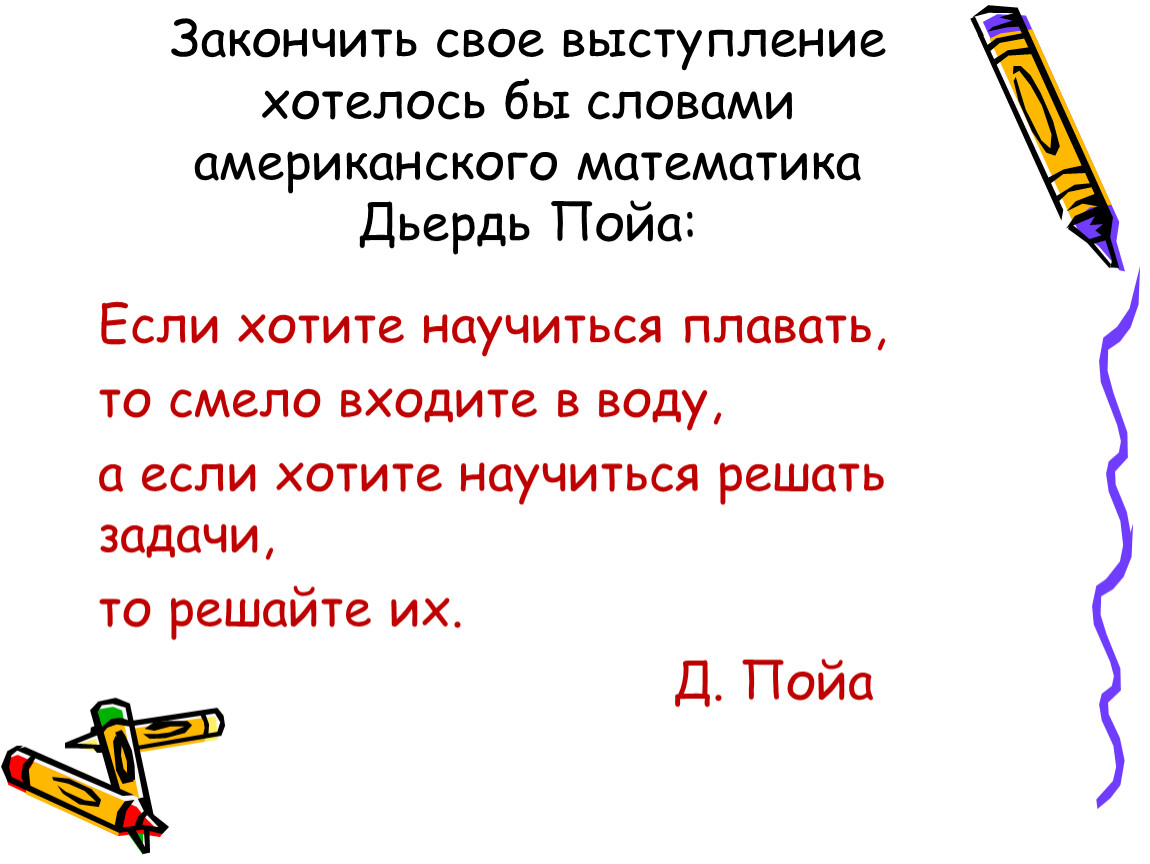 Закончить свое выступление хотелось бы словами американского математика Дьердь Пойа: