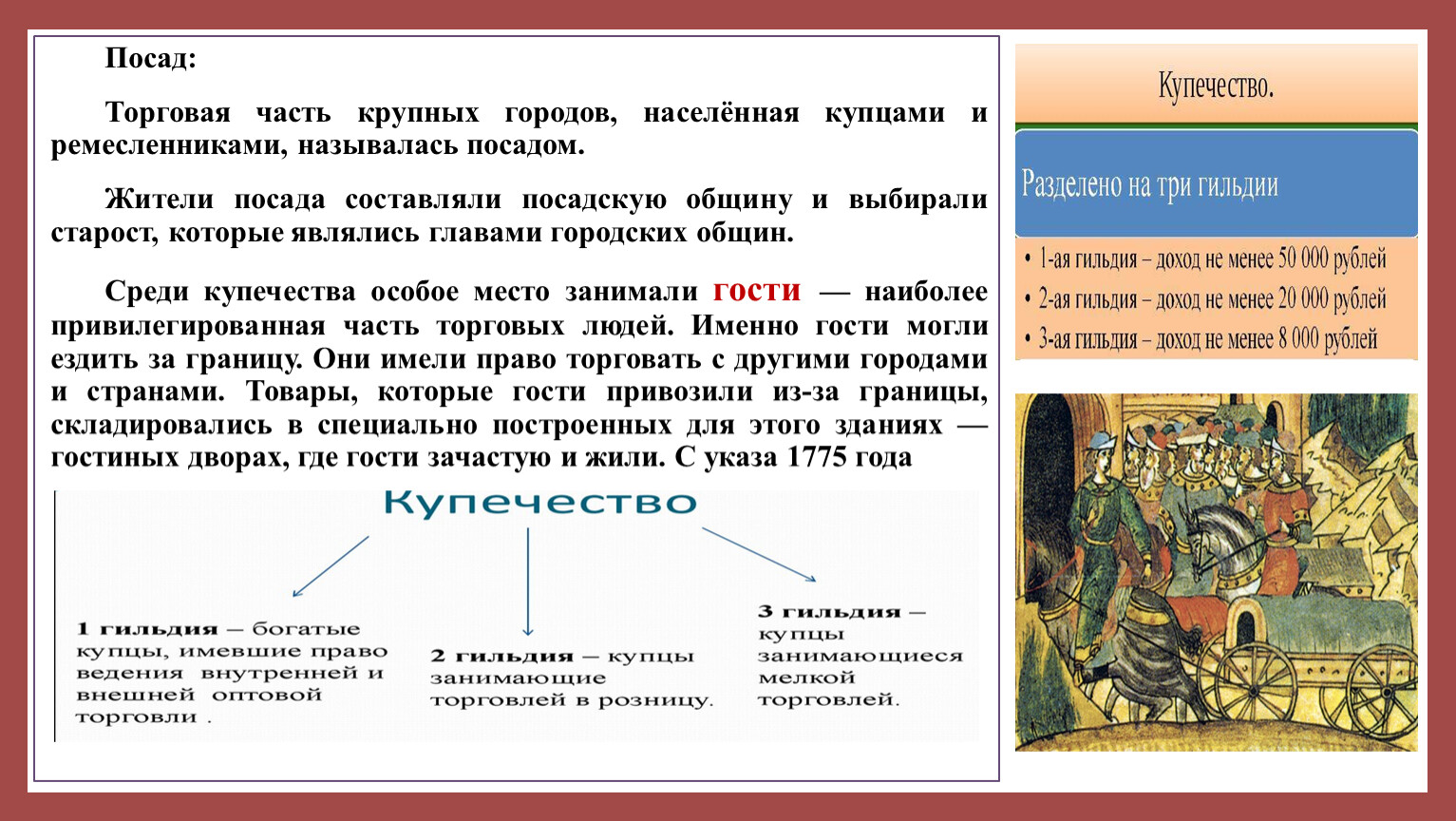 Среди купечества особое место занимали гости — наиболее привилегированная часть торговых людей. Именно гости могли ездить за границу. Они имели право торговать с другими городами и странами. Товары, которые гости привозили из-за границы, складировались в специально построенных для этого зданиях — гостиных дворах, где гости зачастую и жили. С указа 1775 года