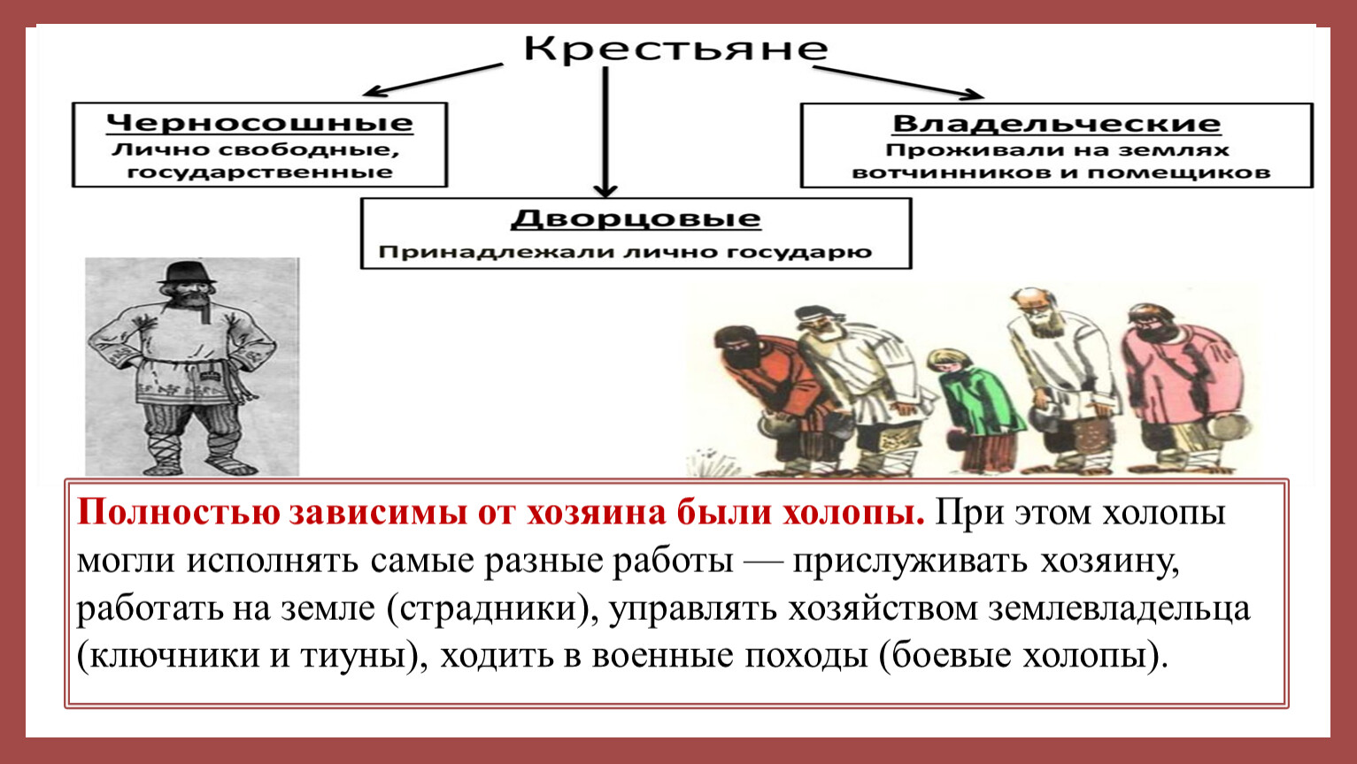 Полностью зависимы от хозяина были холопы. При этом холопы могли исполнять самые разные работы — прислуживать хозяину, работать на земле (страдники), управлять хозяйством землевладельца (ключники и тиуны), ходить в военные походы (боевые холопы).